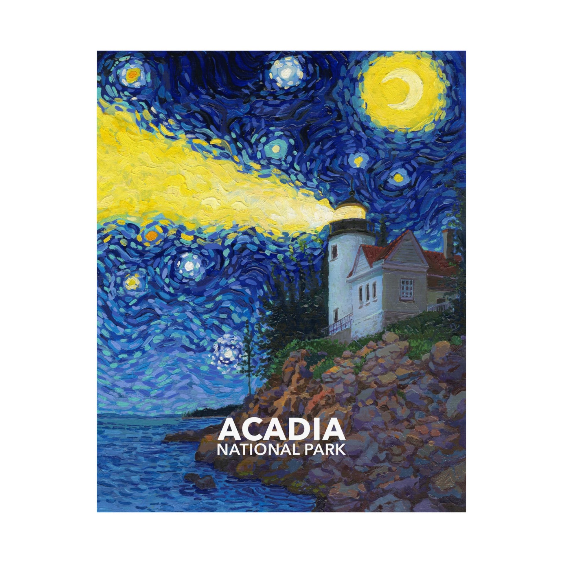 This Acadia National Park poster features one of the many lighthouses that illuminate the Maine coast. It is painted in the style of "Starry Night" by Vincent Van Gogh. The large 24"x36" size is sure to be a conversation starter, while the 16"x20" looks great and is easy to frame. This design is exclusive to National Parks Partnership so you won't find it anywhere else!