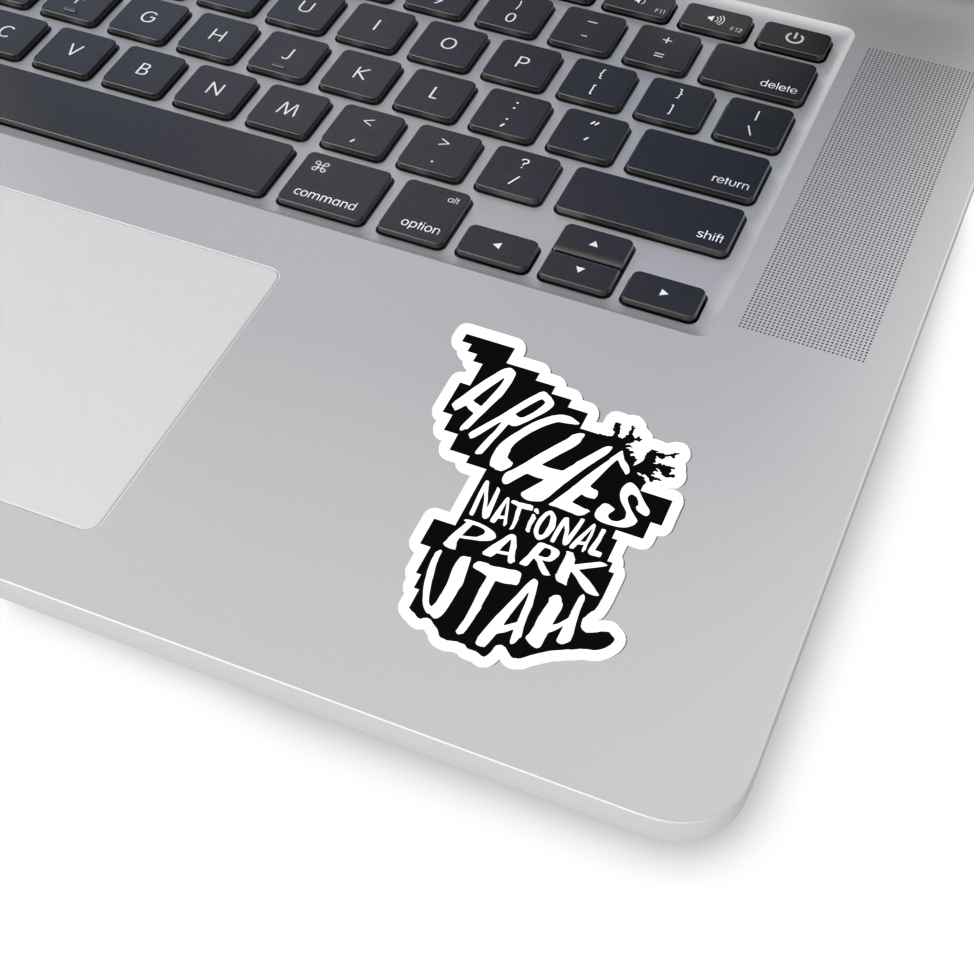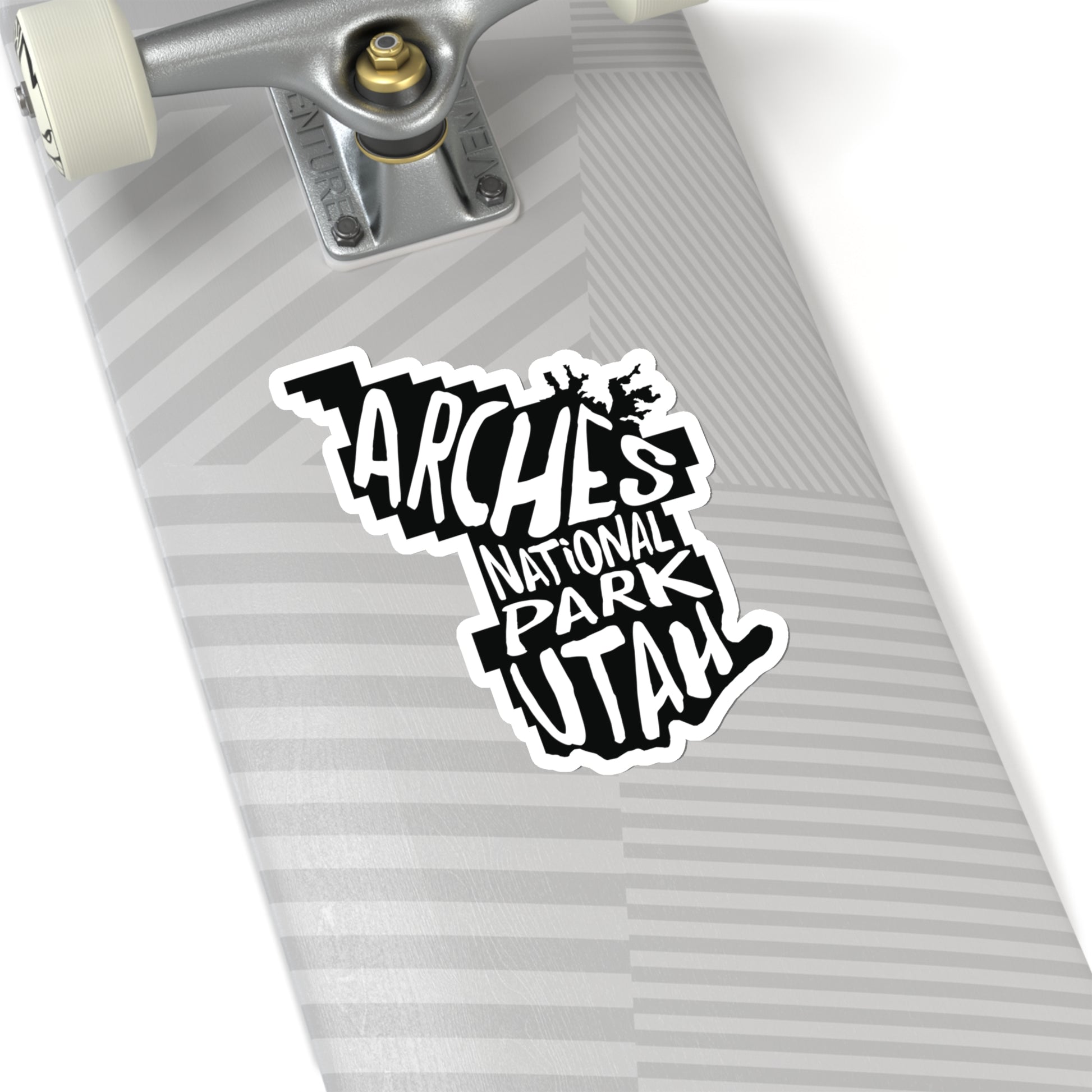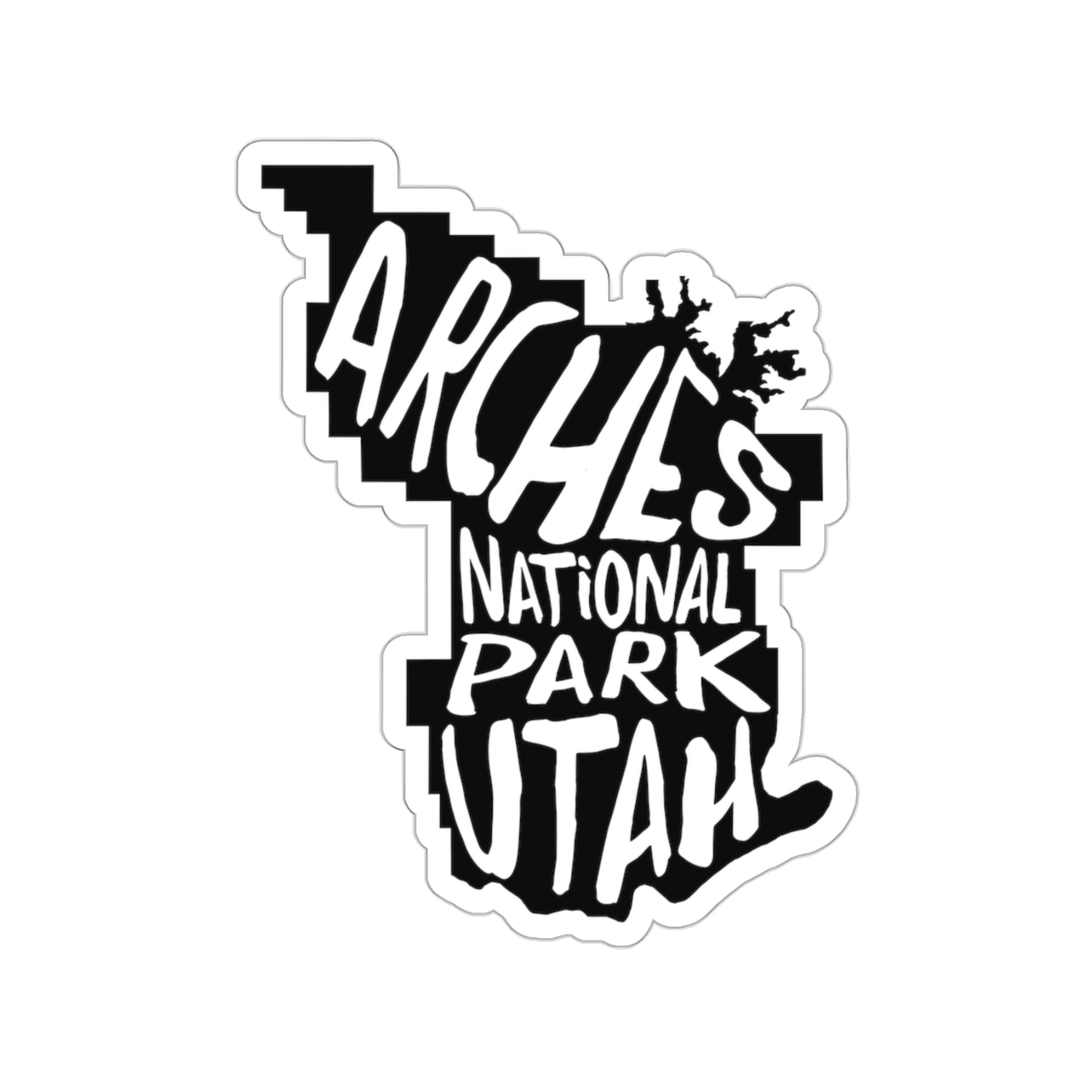 Celebrate the iconic sandstone arches with this Arches National Park Sticker. The design features the name of the park stenciled onto a map of the park.