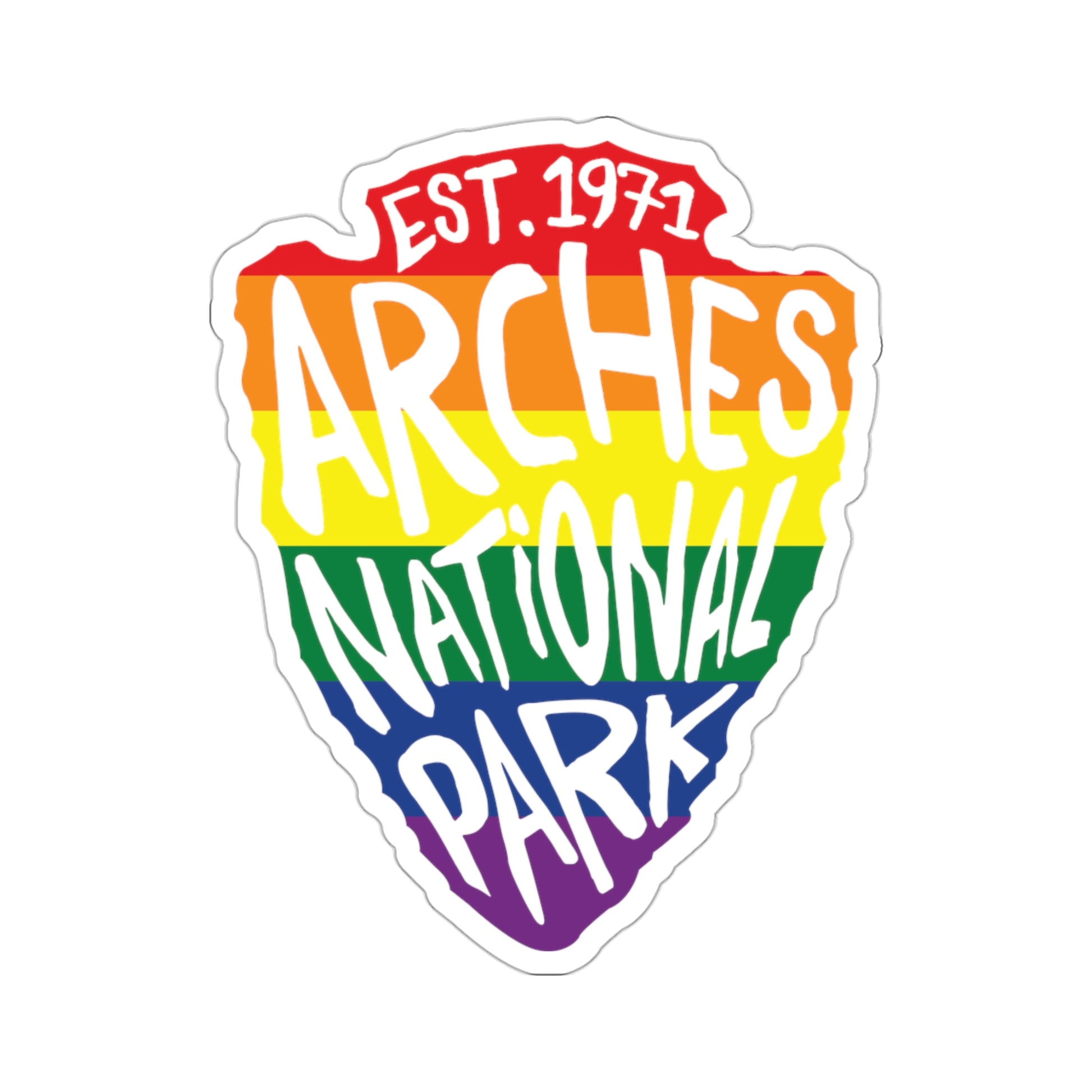This beautiful sticker features a rainbow-colored arrowhead with the words "Arches National Park" stenciled in chunky white letters. The arrowhead is a symbol of the National Park Service, and this sticker is a great way to show your support for our national parks.