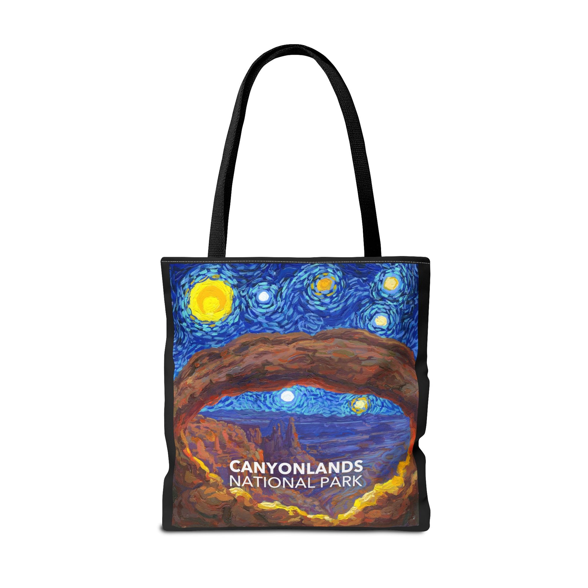 This Canyonlands National Park poster is inspired by Vincent van Gogh's iconic "The Starry Night". This tote bag is the perfect companion for your next national park adventure. Even if you are just taking a trip to the shops, this tote bag features a vibrant design, long straps and thick seams. Reduce your plastic waste and support the national parks! Printed in the USA. Every purchase helps support national parks.