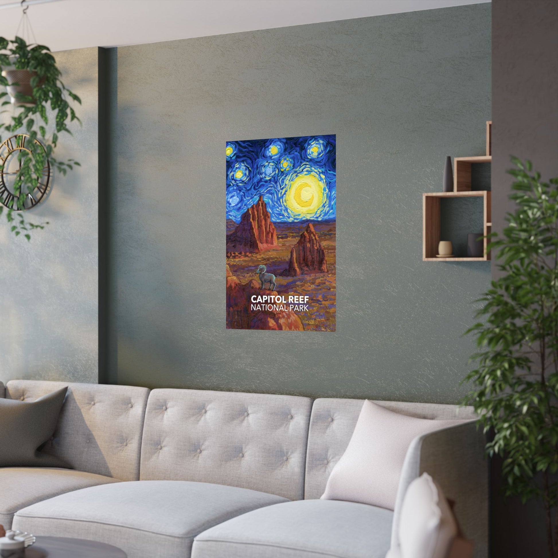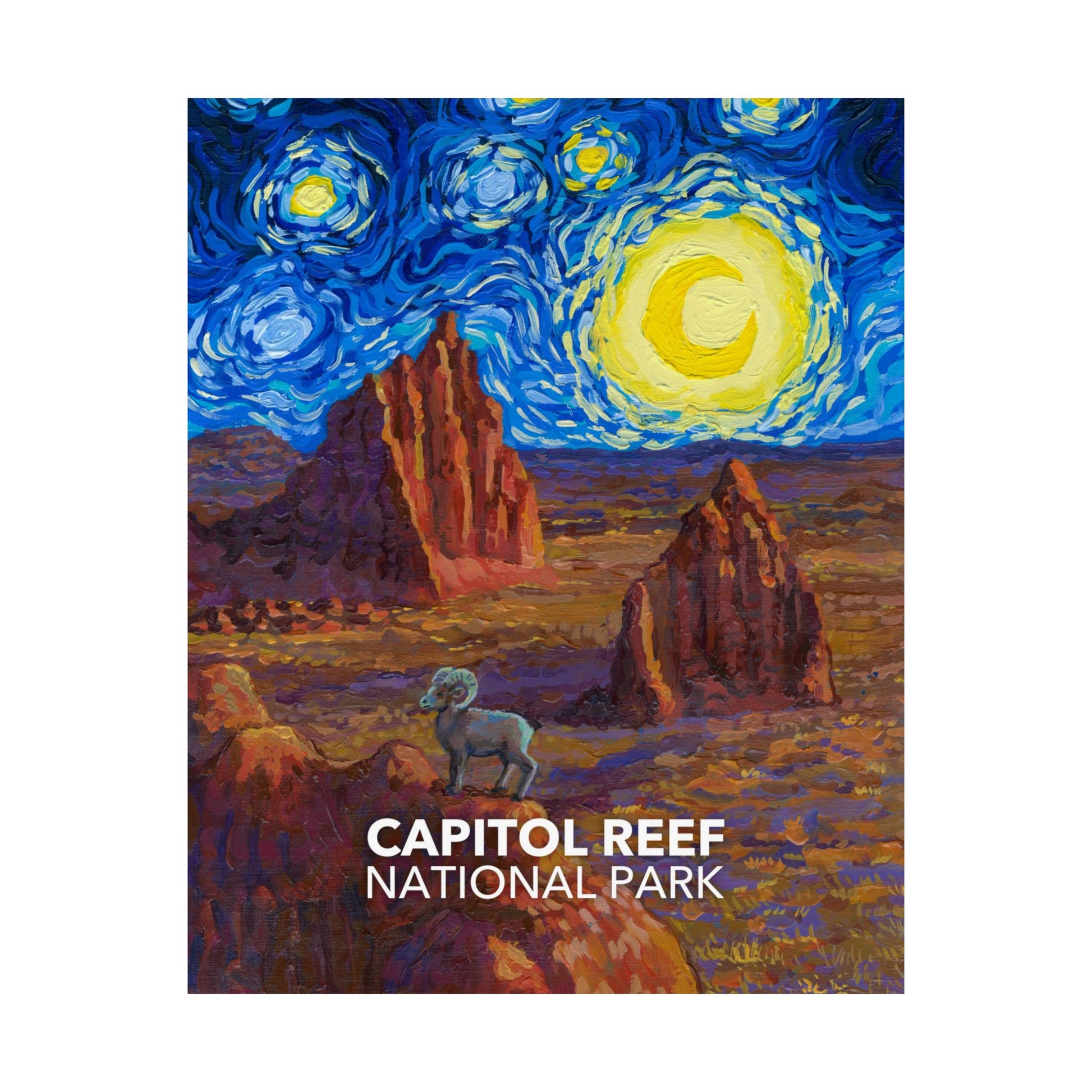 This Capitol Reef National Park poster is designed in the style of "The Starry Night" by Vincent Van Gogh. The large 24"x36" size is sure to be a conversation starter, while the 16"x20" looks great and is easy to frame. This design is exclusive to National Parks Collective so you won't find it anywhere else!