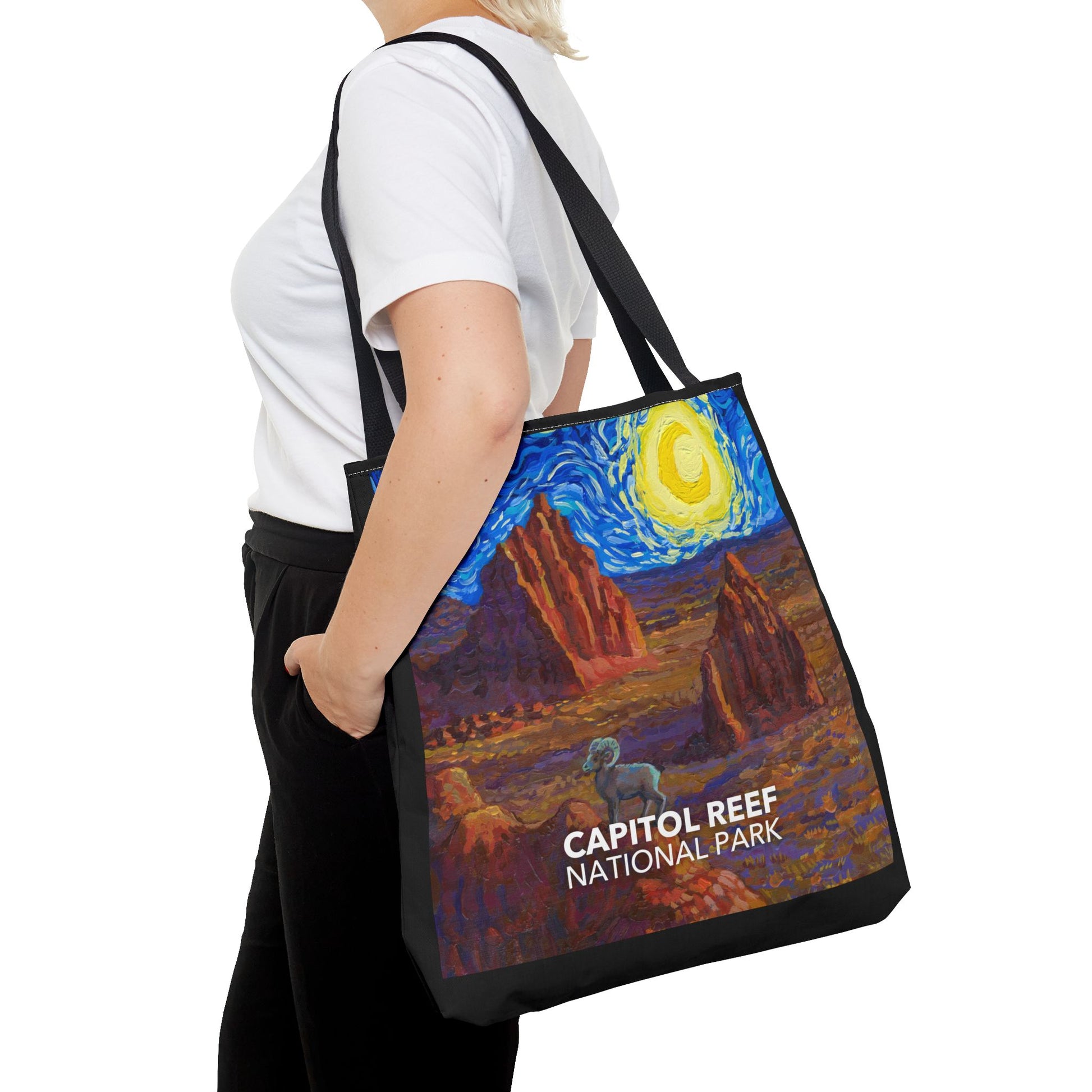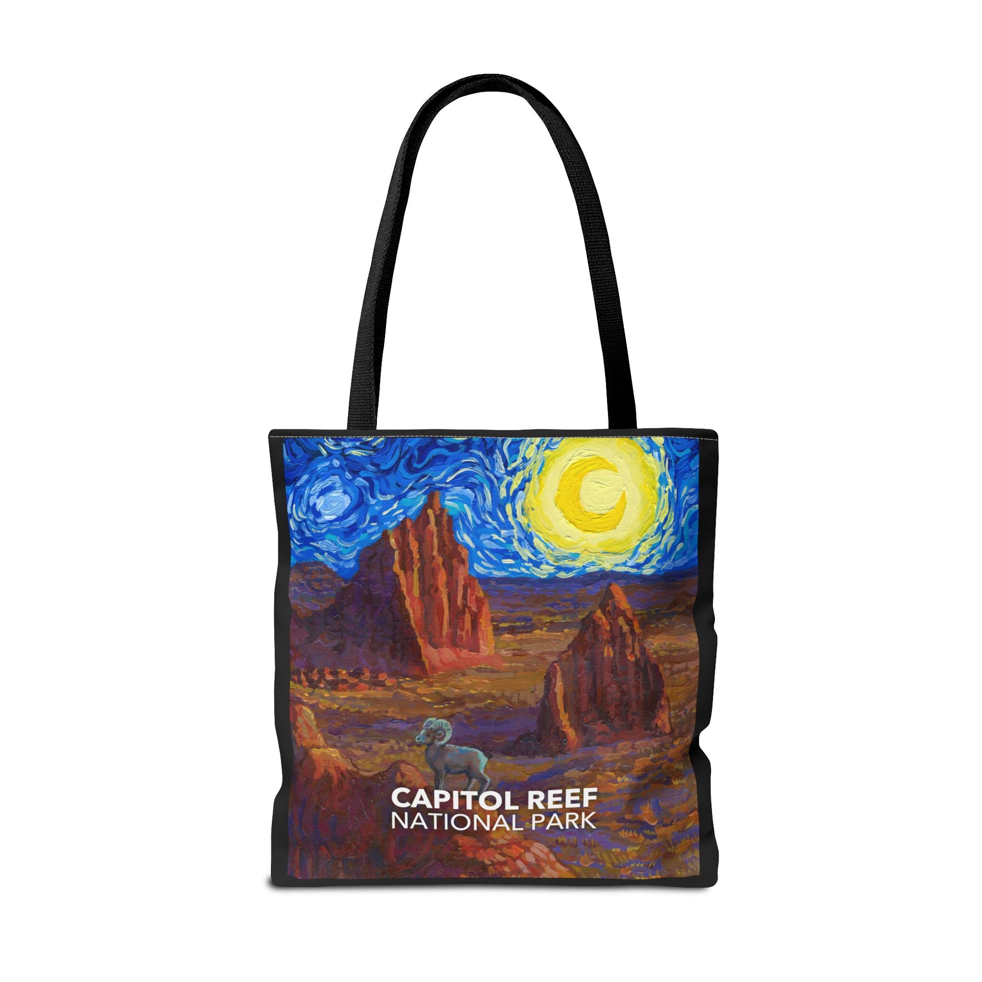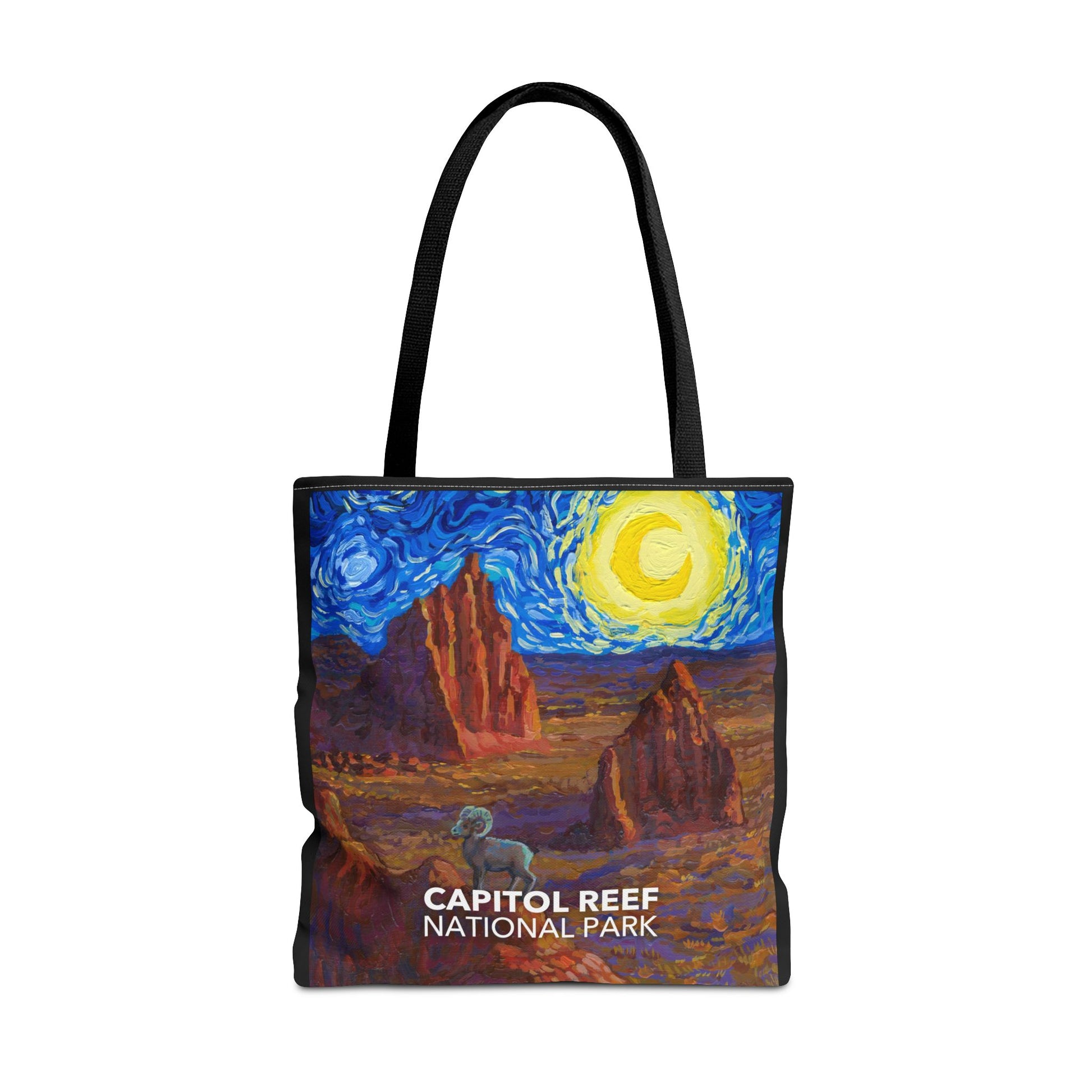 This Capitol Reef National Park poster is inspired by Vincent van Gogh's iconic "The Starry Night". This tote bag is the perfect companion for your next national park adventure. Even if you are just taking a trip to the shops, this tote bag features a vibrant design, long straps and thick seams. Reduce your plastic waste and support the national parks! Printed in the USA. Every purchase helps support national park charities.