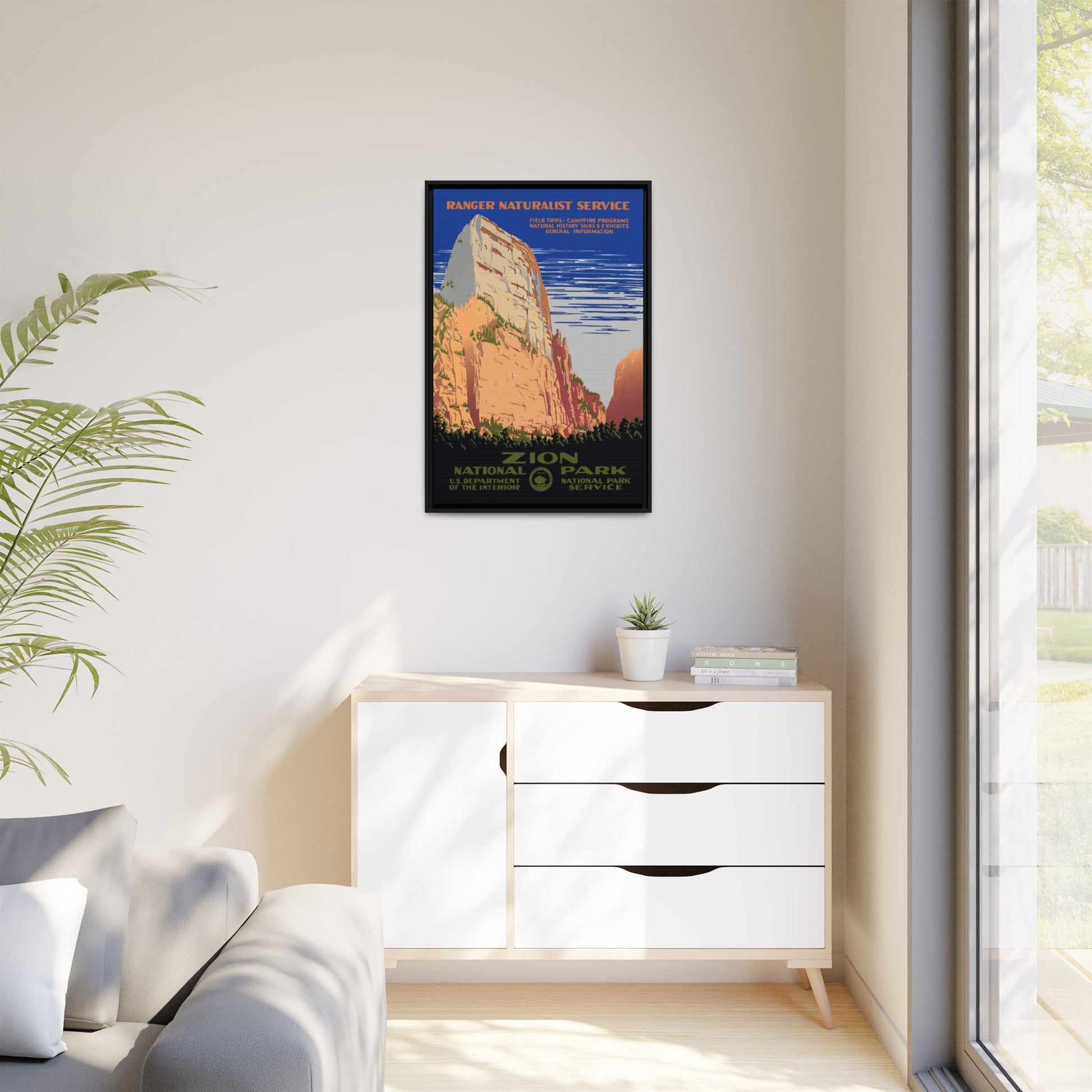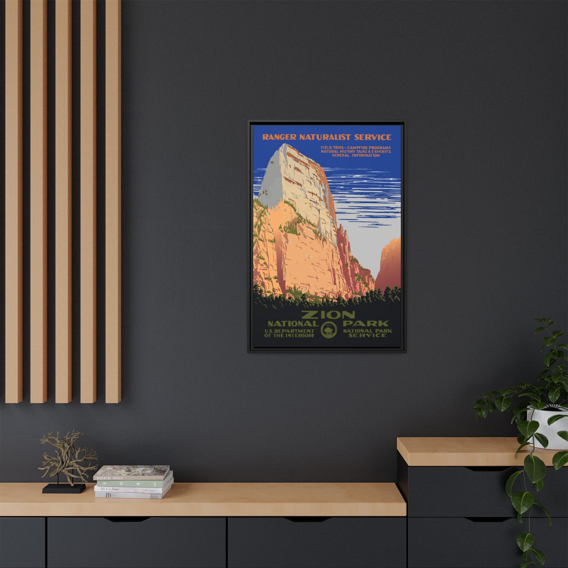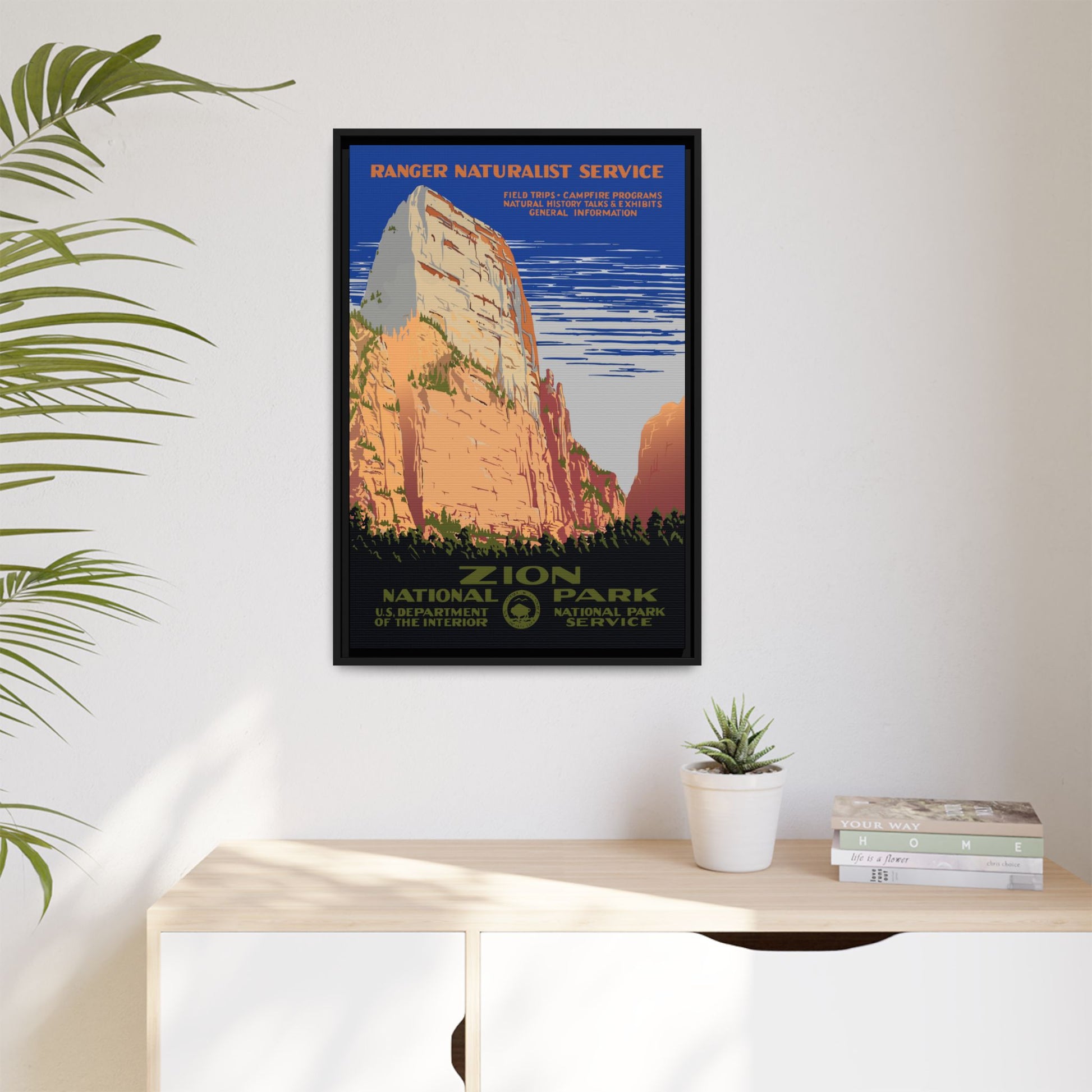This Zion National Park framed canvas makes a stunning statement in any room. The design is one of the original WPA National Park Posters from the 1930s. We painstakingly cleaned and recolored scans of the historic posters. You won't find better recreations.