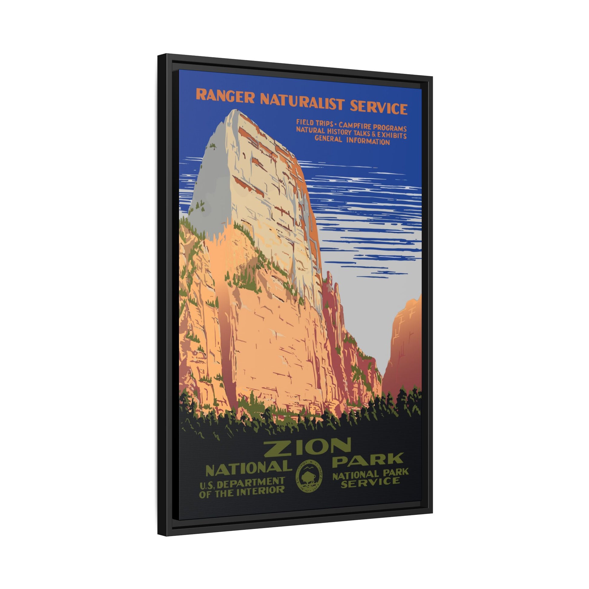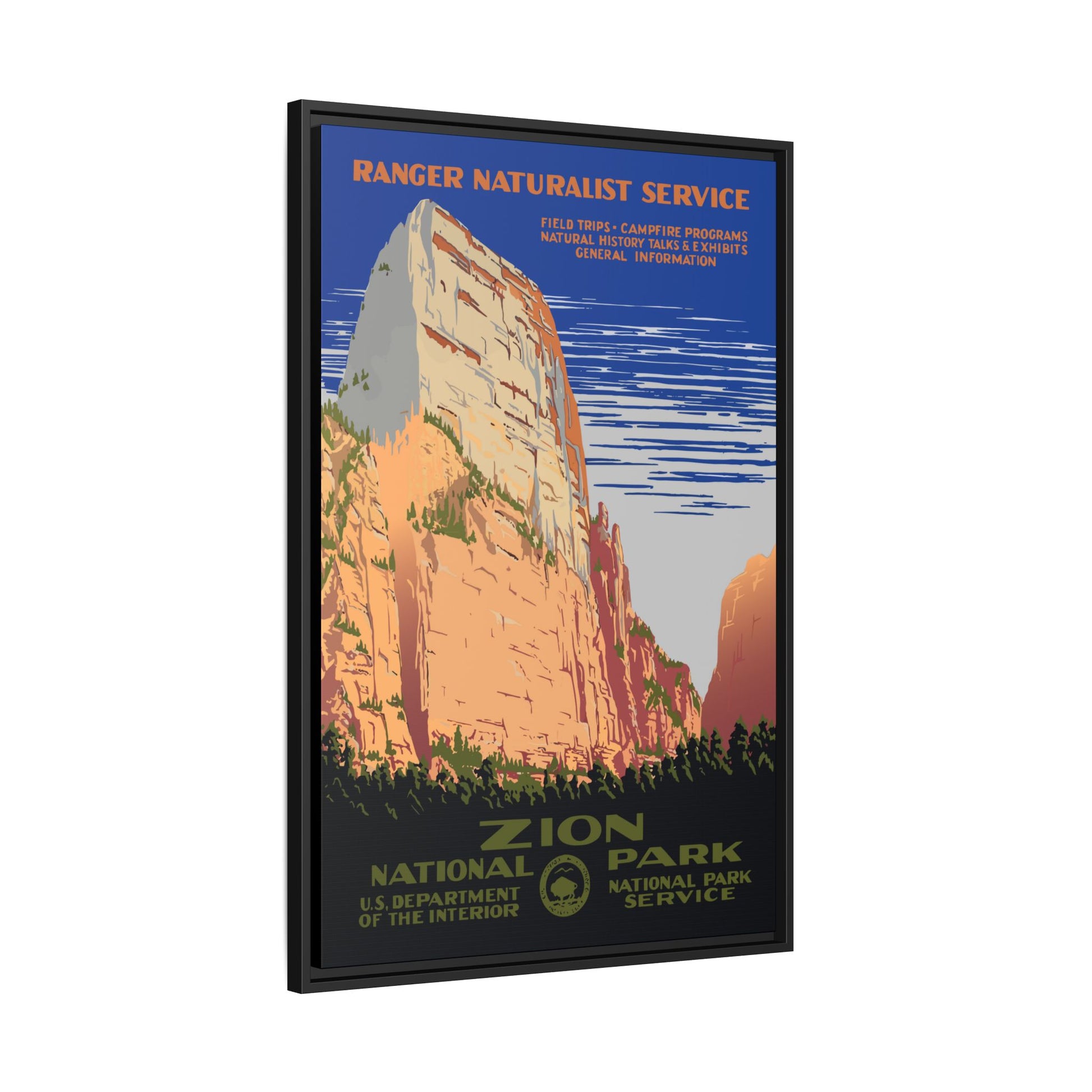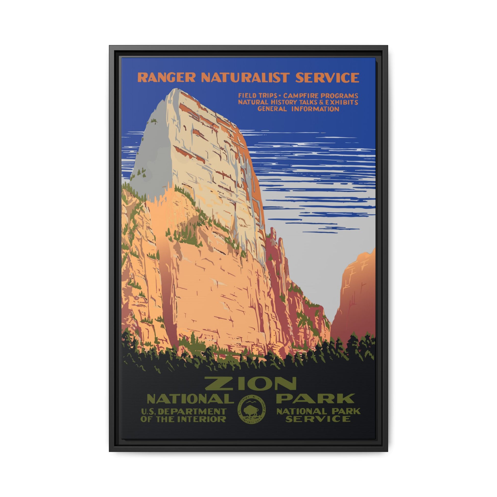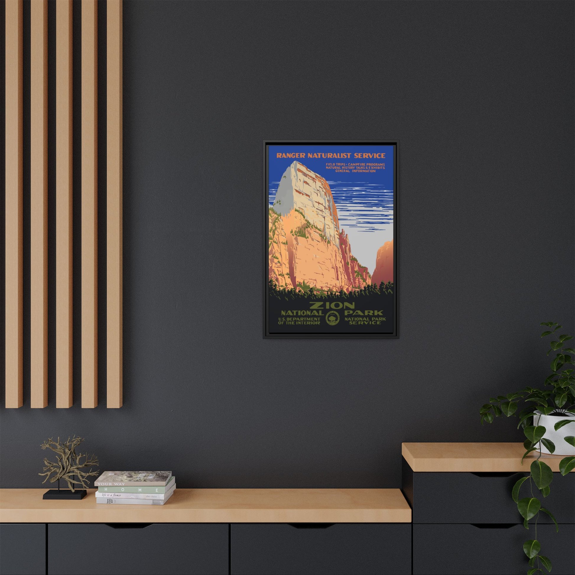 This Zion National Park framed canvas makes a stunning statement in any room. The design is one of the original WPA National Park Posters from the 1930s. We painstakingly cleaned and recolored scans of the historic posters. You won't find better recreations.