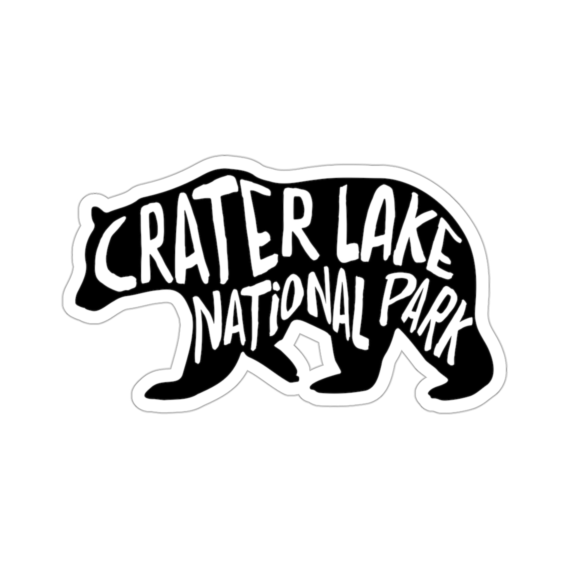 Show your love for Crater Lake National Park with this stylish sticker! The sticker features a black silhouette of a black bear with the name of the park stenciled on top in chunky white lettering. The sticker is available in three sizes: 3"x 3", 4"x 4", and 6"x 6". It is made for indoor use and is not waterproof. The sticker is kiss cut so the edge of the sticker mirrors the design.
