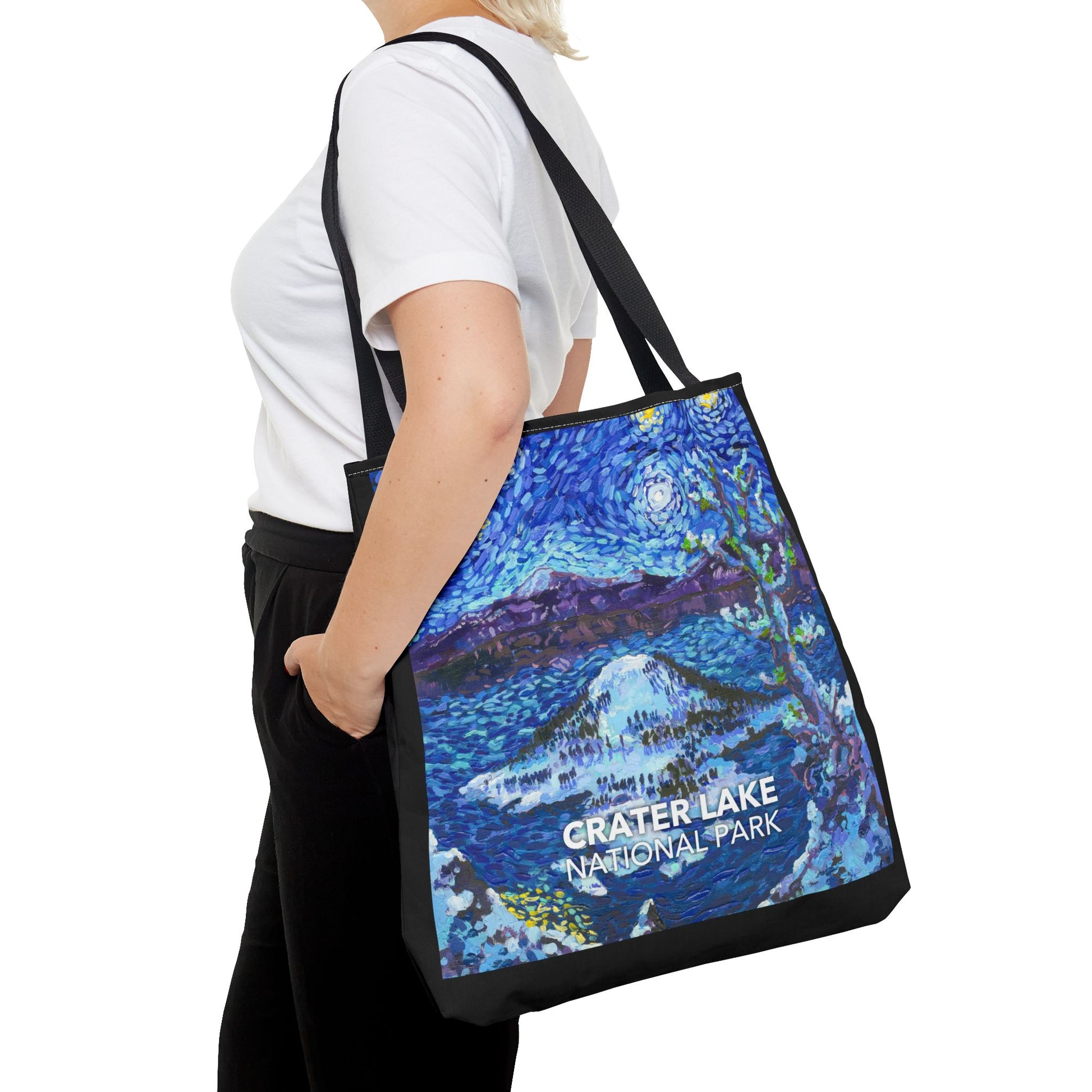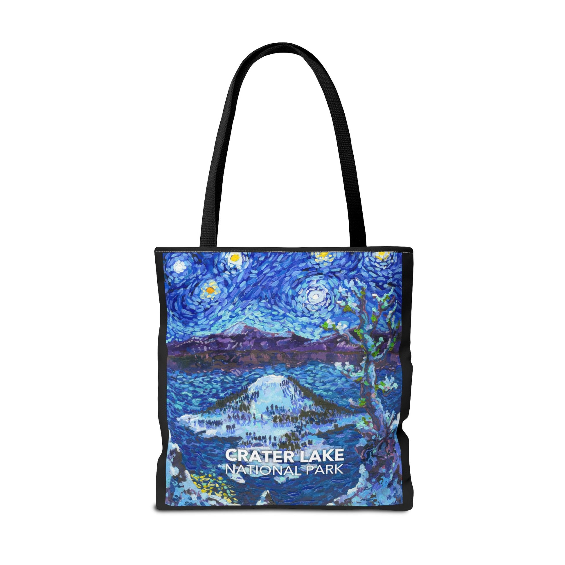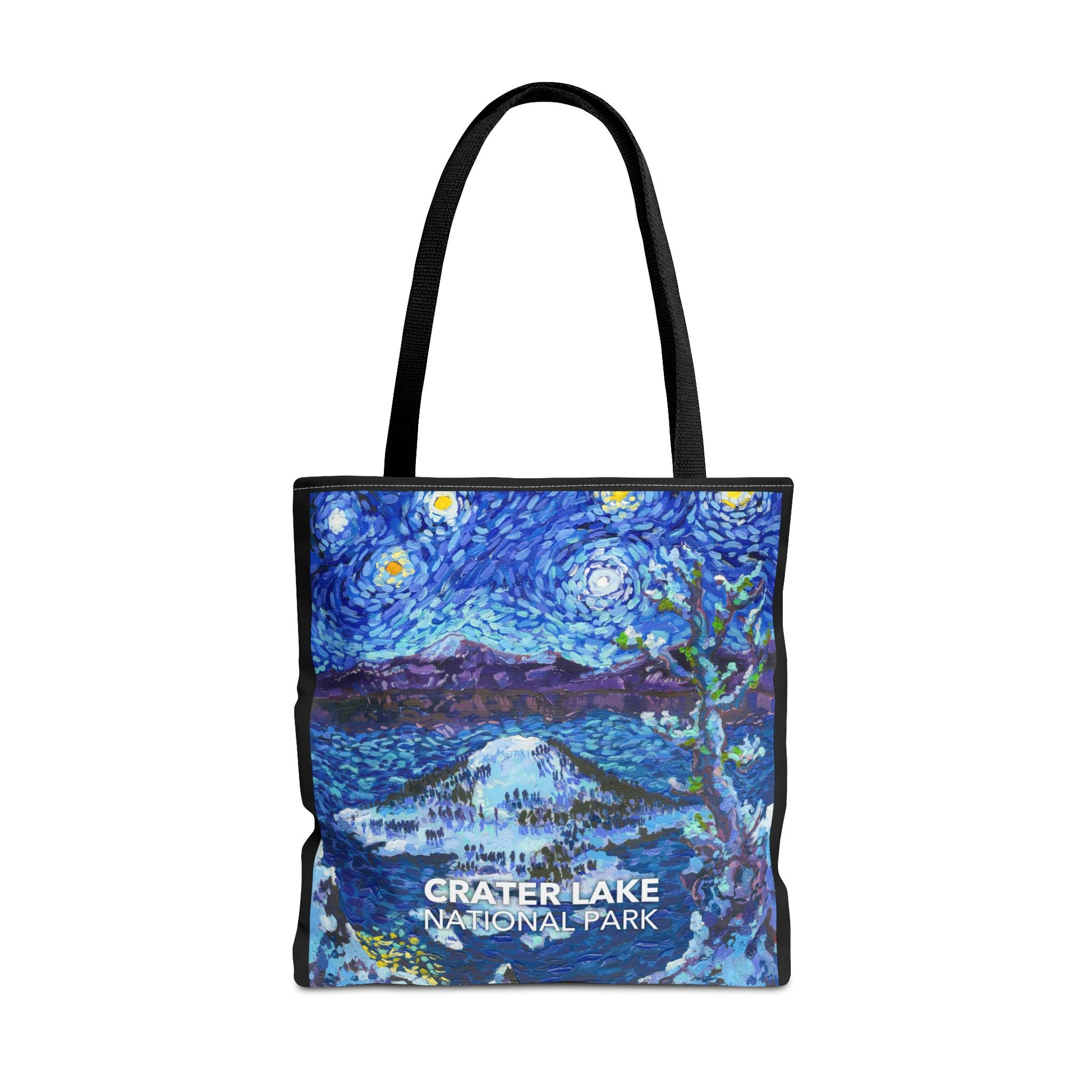 This Crater Lake National Park Tote Bag features the famous view of Wizard Island in the style of Vincent van Gogh's iconic "The Starry Night". This tote bag is the perfect companion for your next national park adventure. Even if you are just taking a trip to the shops, this tote bag features a vibrant design, long straps and thick seams. Reduce your plastic waste and support the national parks! Printed in the USA. Every purchase helps support national parks.