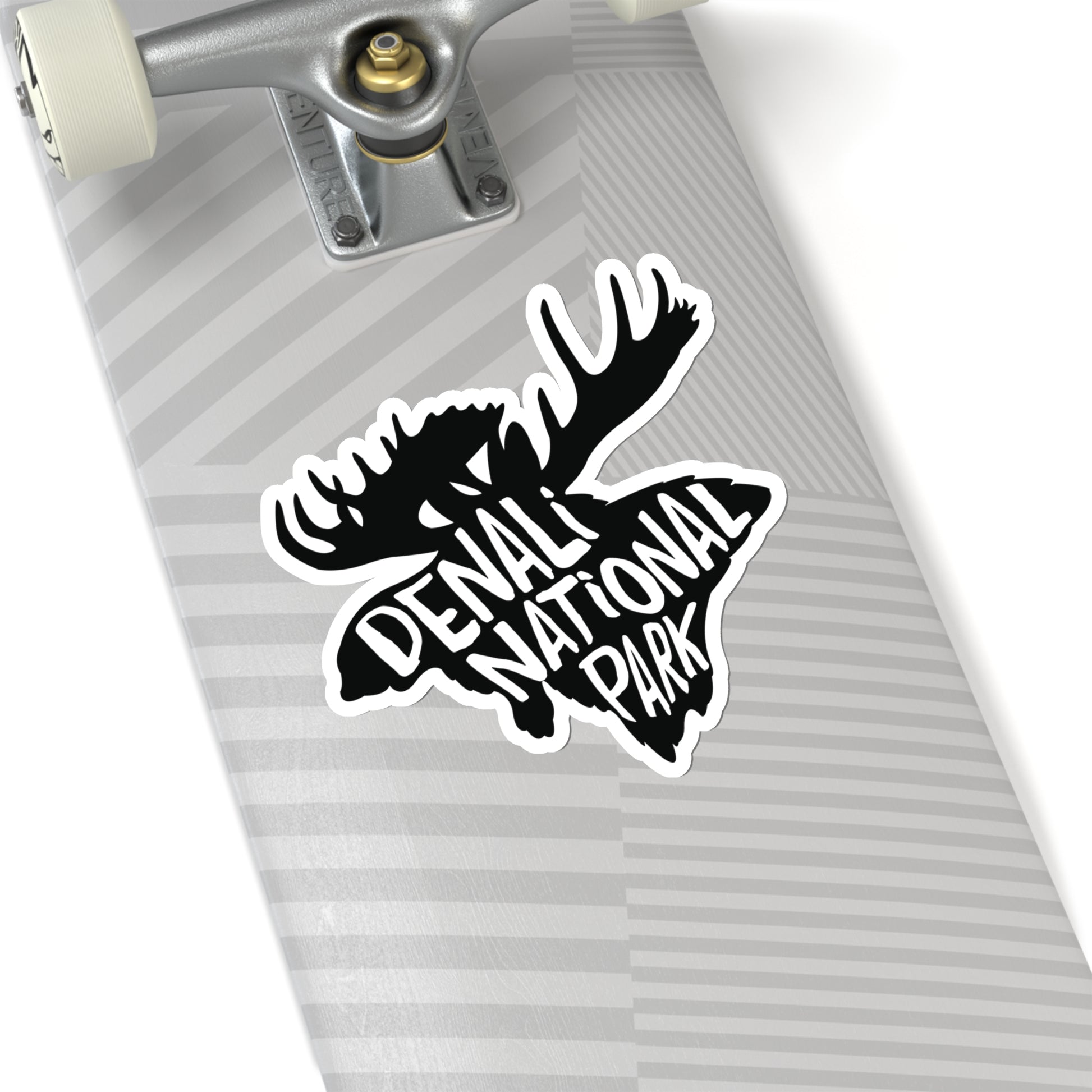 This beautiful sticker features a black silhouette of a moose against a white background. The name of the park is stenciled in white lettering across the top. The sticker is available in three sizes: 3"x 3", 4"x 4", and 6"x 6". It is for indoor use only and is not waterproof. The sticker is kiss cut, so the edge of the sticker mirrors the design.