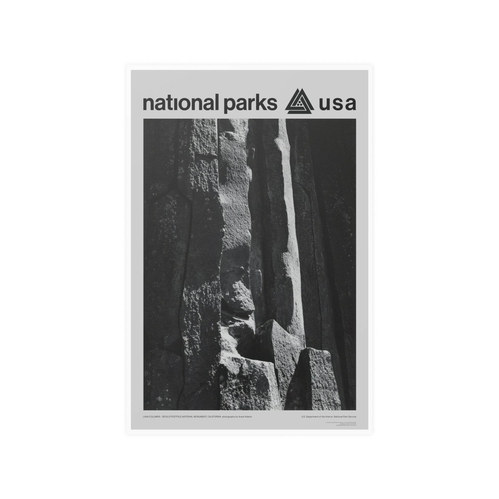 Devils Postpile National Monument in California's Sierra Nevada Mountains showcases the remarkable basalt columns of the Devil's Postpile, formed by volcanic activity. Visitors can hike, witness Rainbow Falls, and explore the surrounding pristine wilderness. In 1968, his images were featured on a series of posters created by the Department of the Interior and National Park Service.