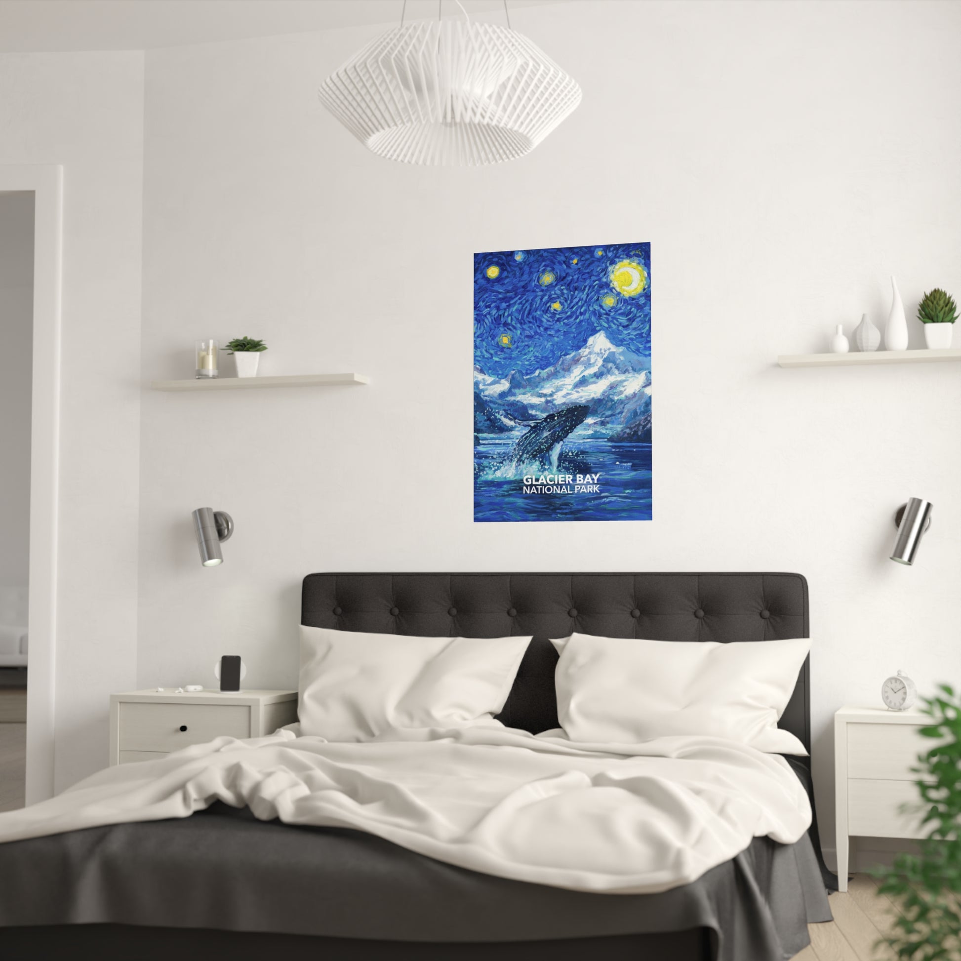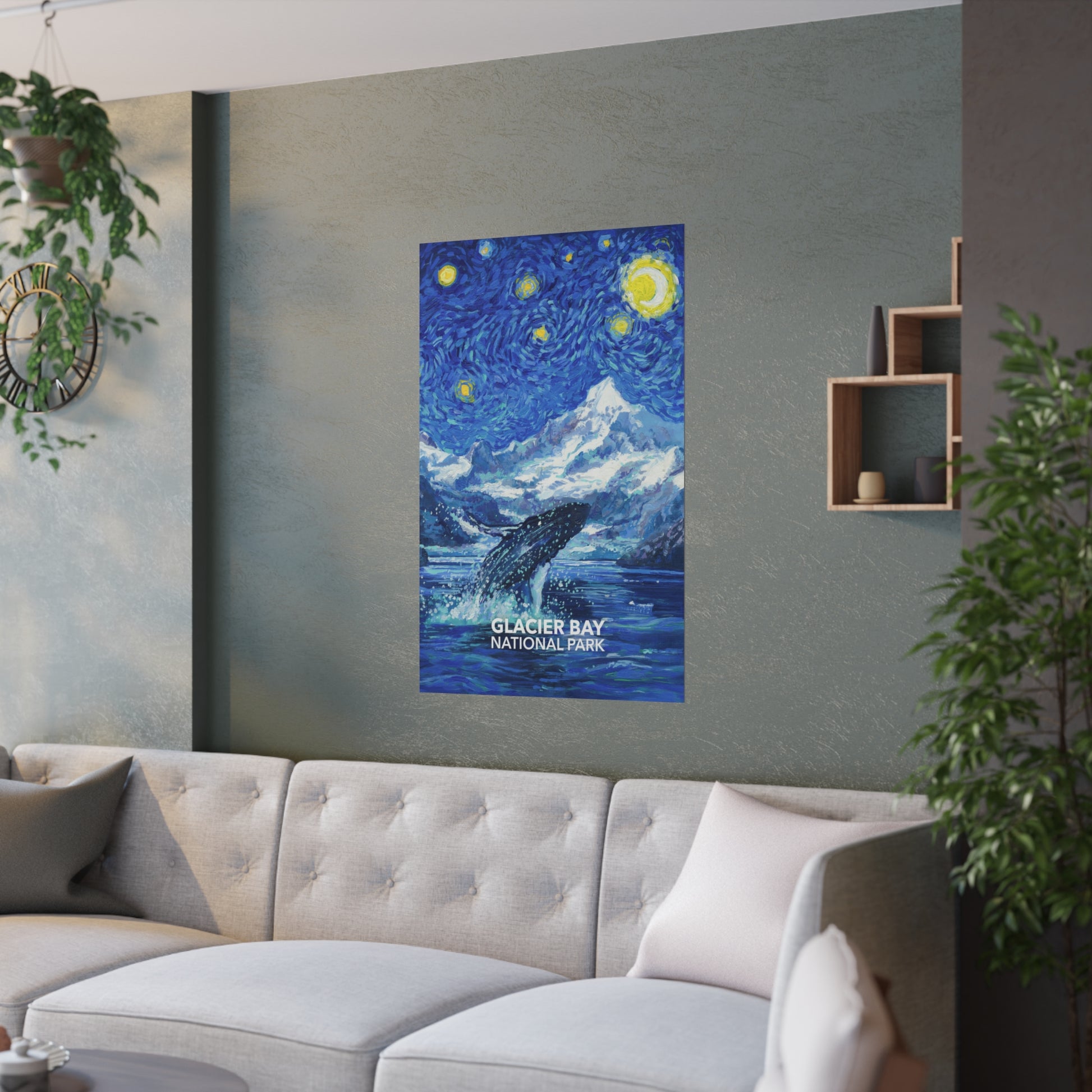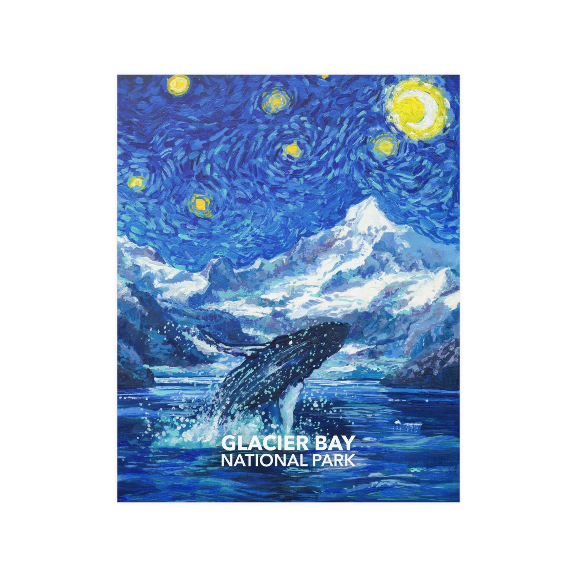 This Glacier Bay National Park Poster features one of the park's most iconic residents, the humpback whale. It is designed in the style of "The Starry Night" by Vincent Van Gogh. The large 24"x36" size is sure to be a conversation starter, while the 16"x20" looks great and is easy to frame. This design is exclusive to National Parks Partnership so you won't find it anywhere else!