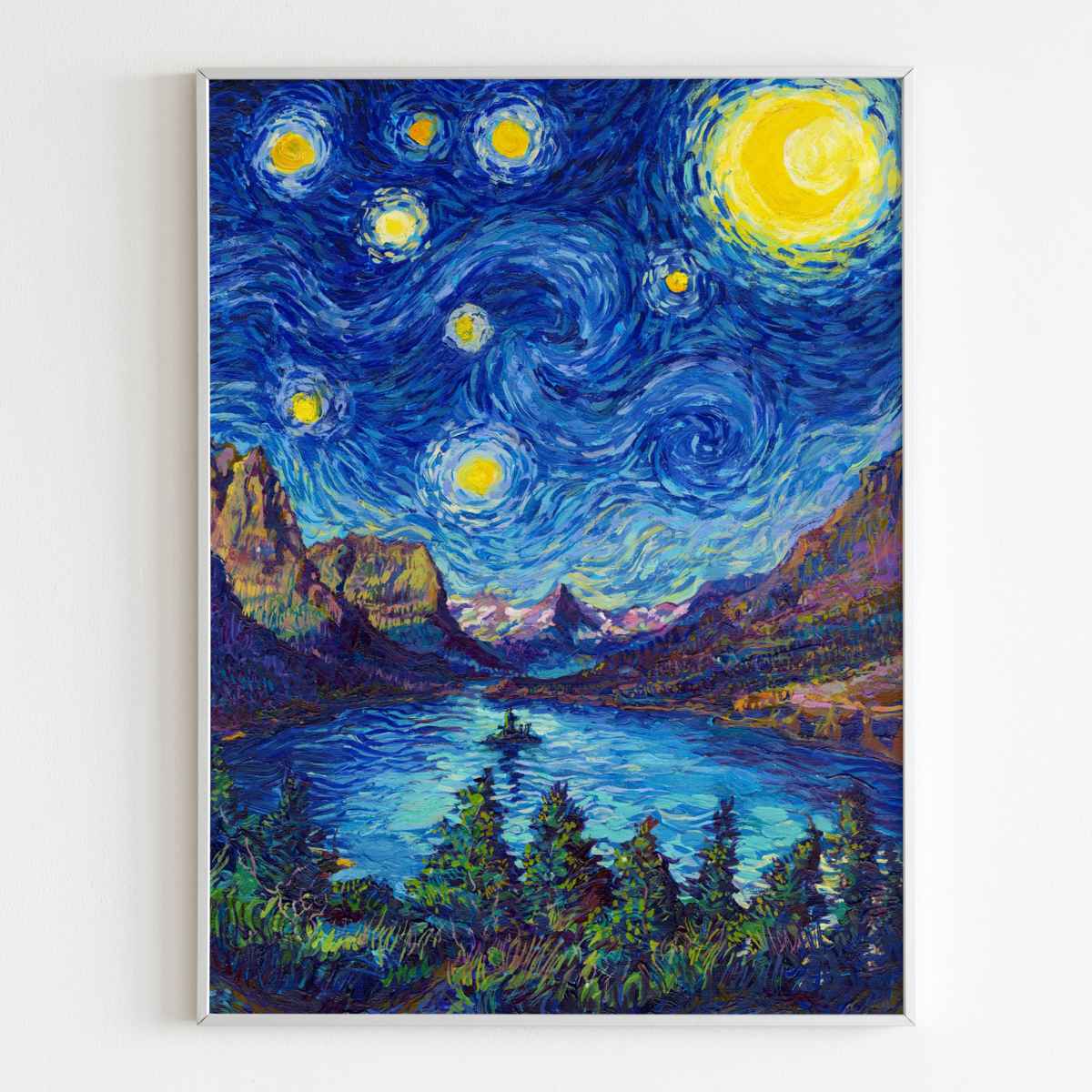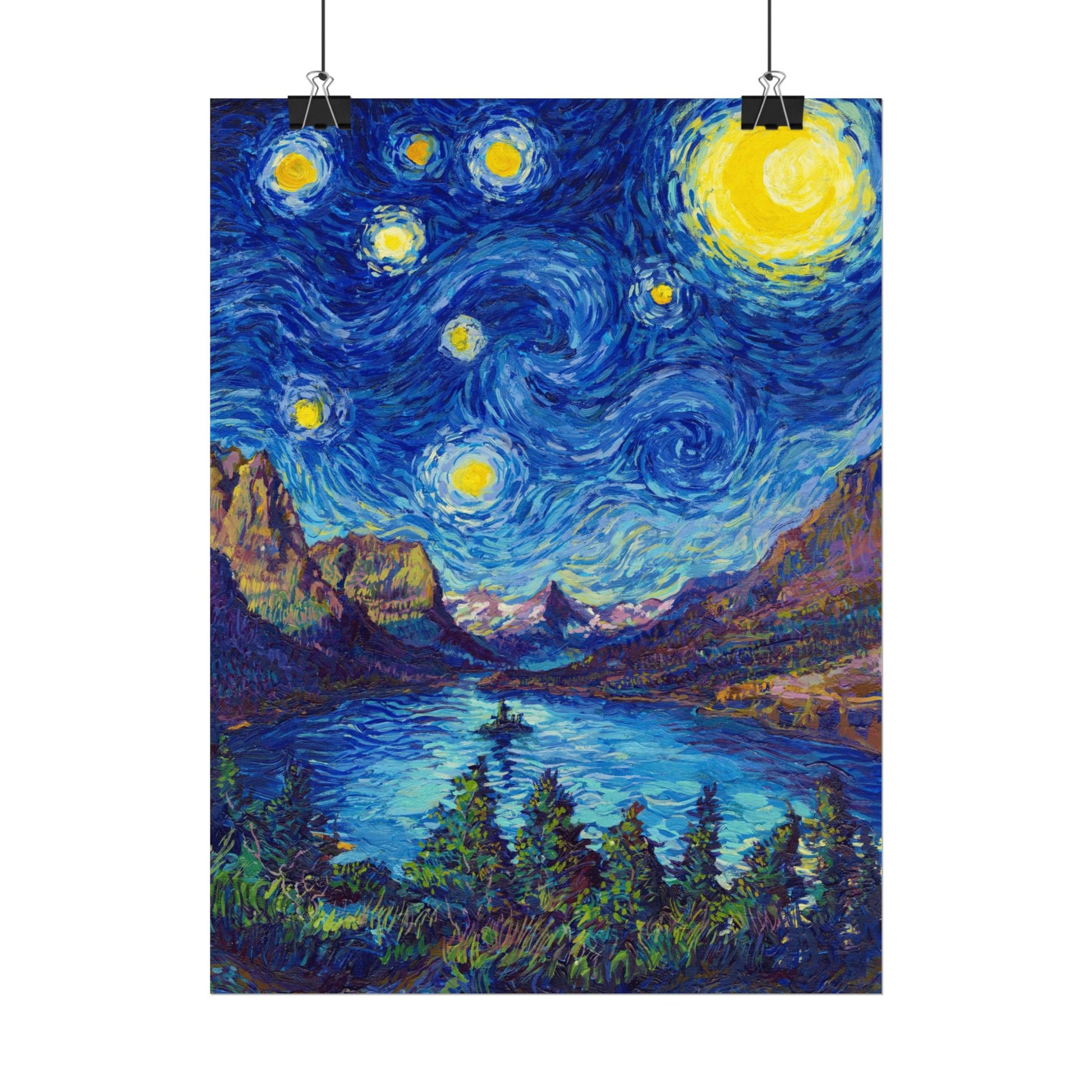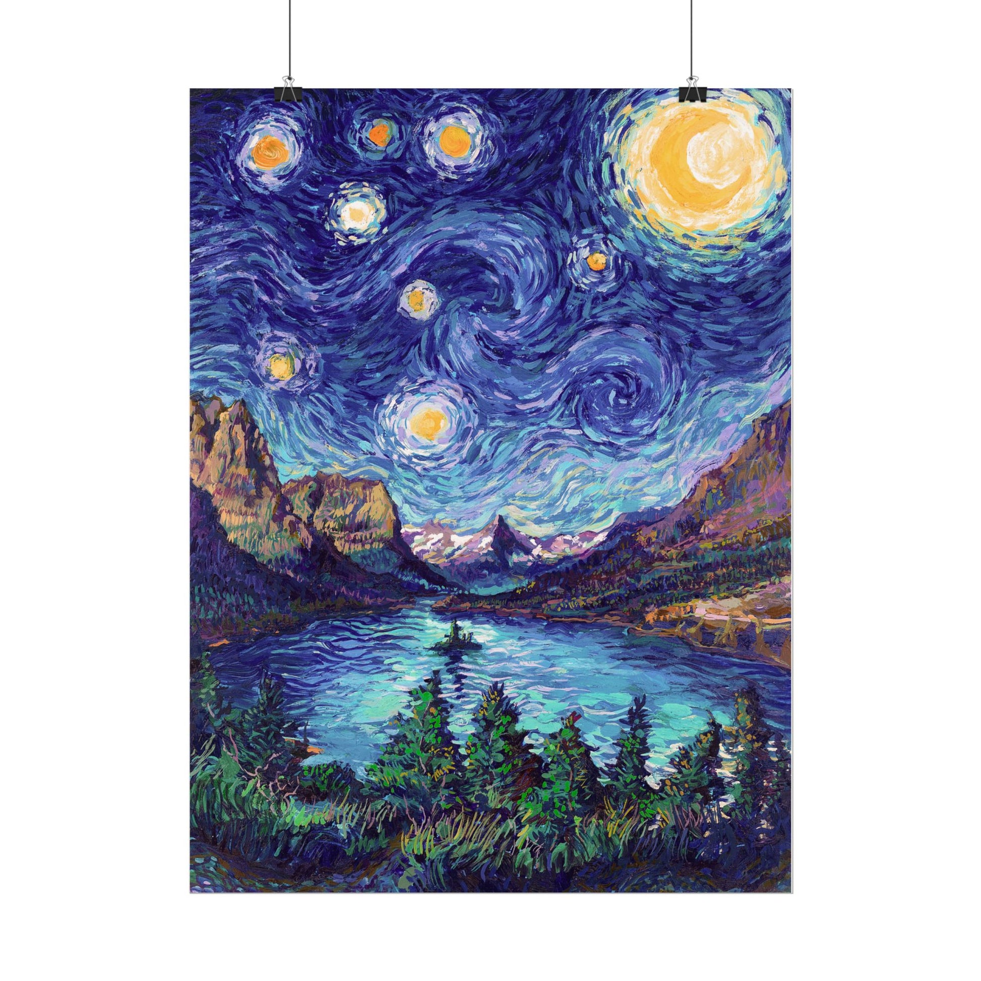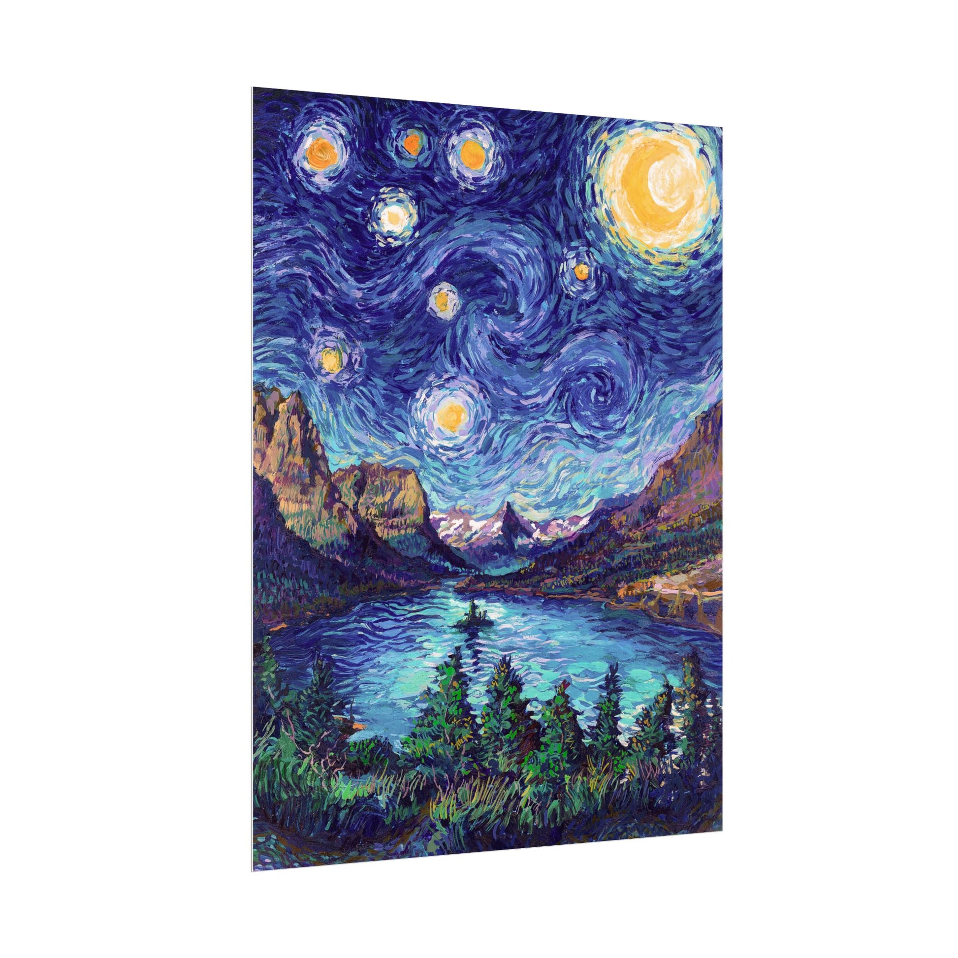 This Glacier National Park Poster has to be seen to be believed! We took the highest resolution scans of our hand-painted Starry Night Glacier National Park painting and printed it on incredible 285gsm textured paper. When combined with the archival inks, the finished product is almost indistinguishable from the original painting. This is the ultimate version of our Starry Night series.