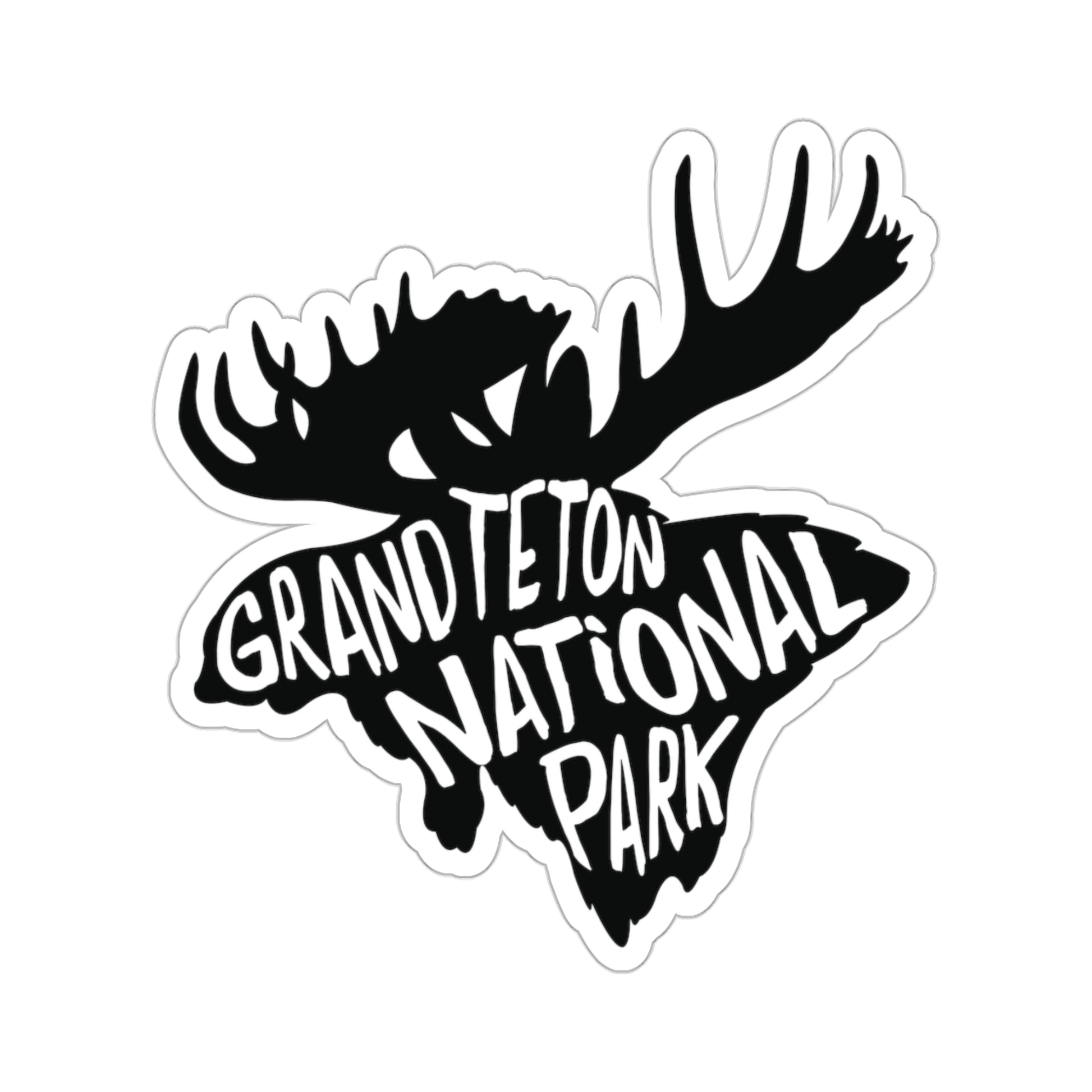Grand Teton National Park is a stunningly beautiful place, home to towering mountains, crystal-clear lakes, and abundant wildlife. This sticker features a black silhouette of a moose, one of the park's most iconic animals. The name of the park is stenciled on top in chunky white lettering.