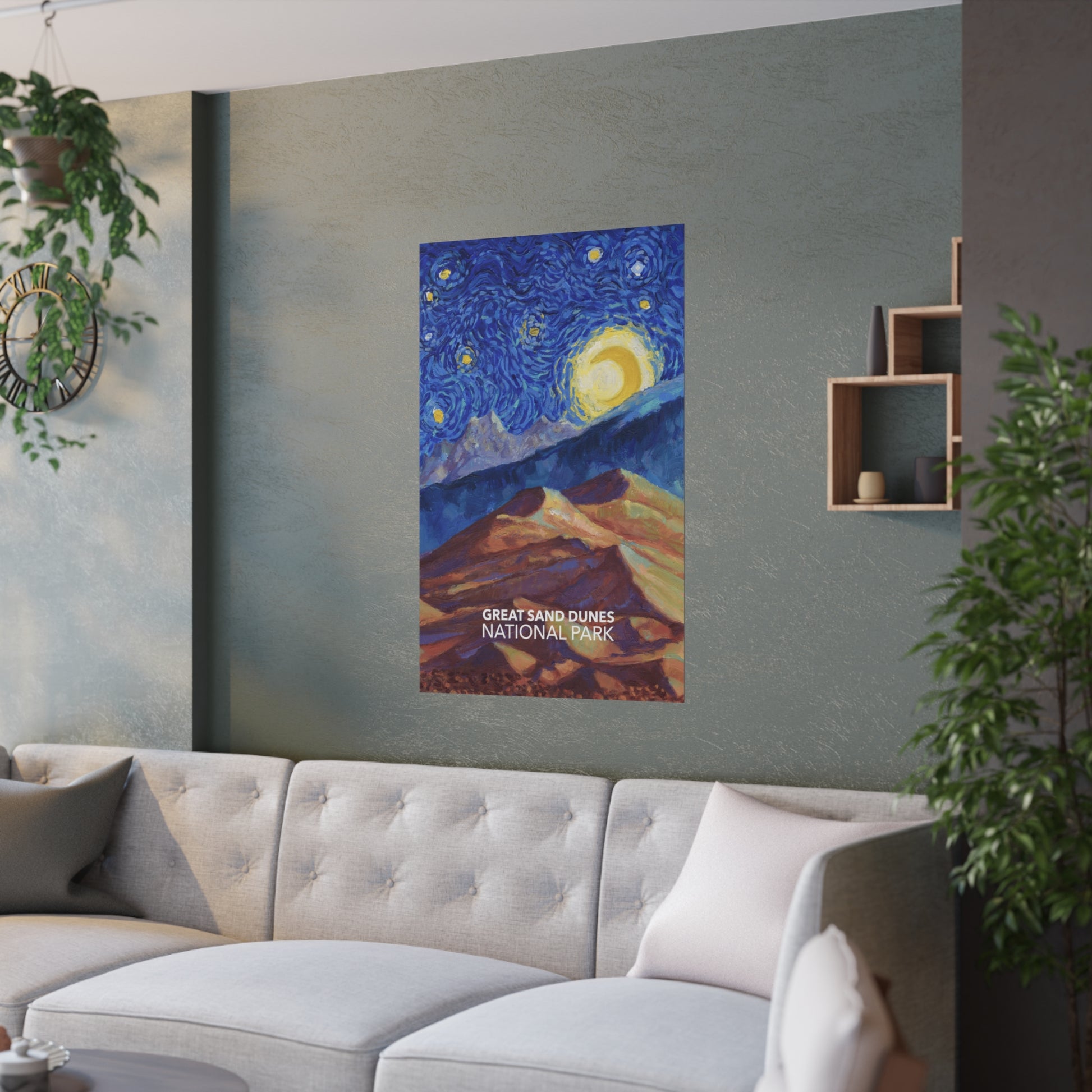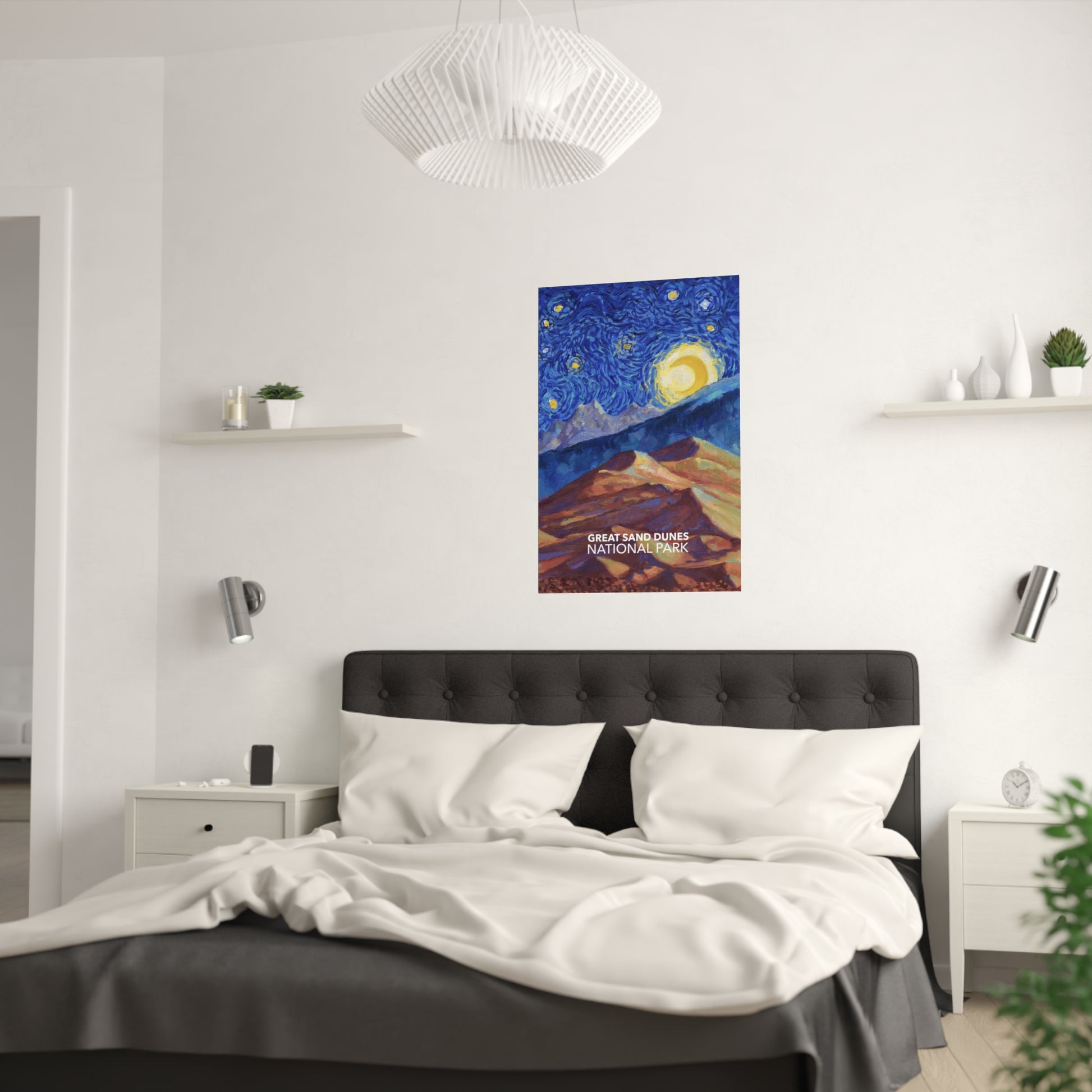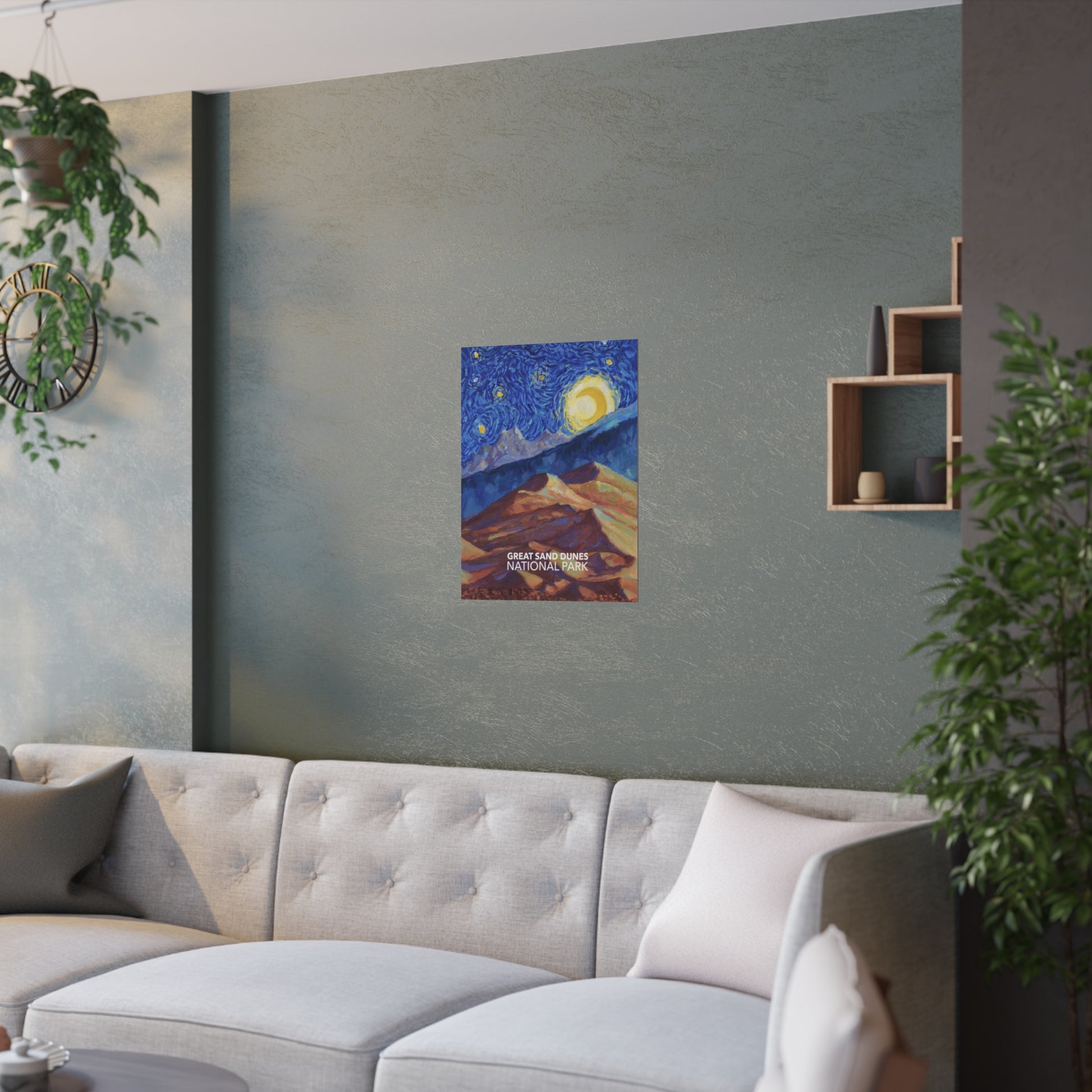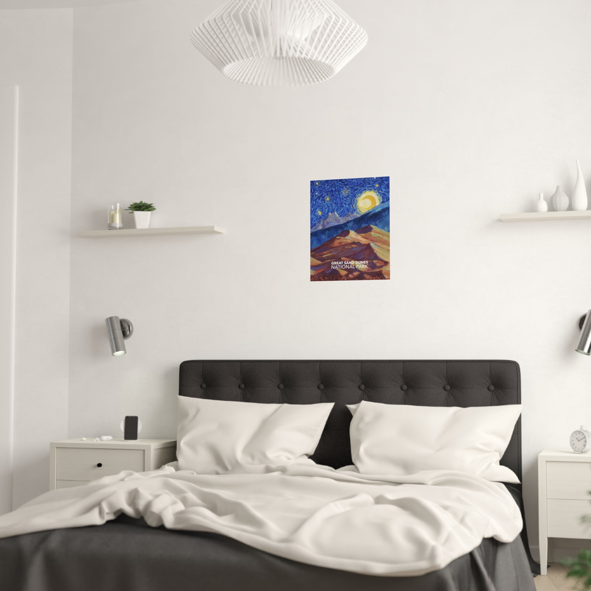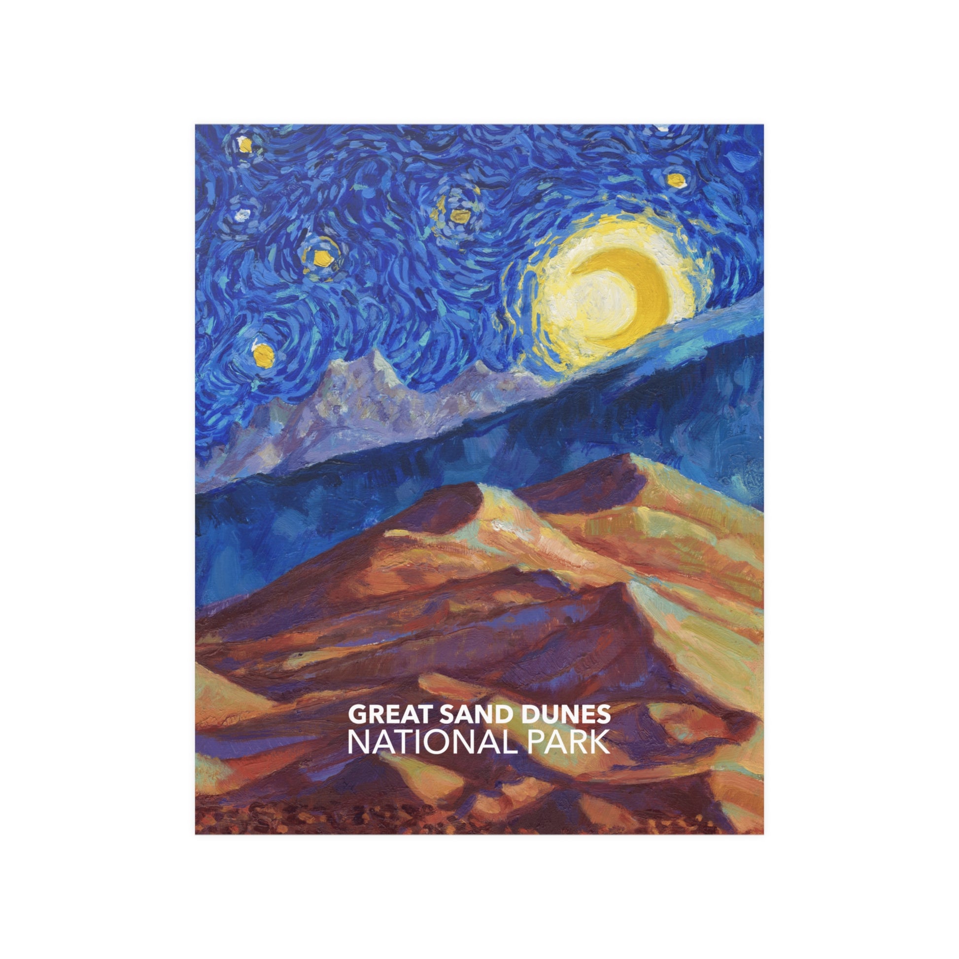 This Great Sand Dunes National Park poster features the imense expanses of sand that the park is known for. It is designed in the style of "The Starry Night" by Vincent Van Gogh. The large 24"x36" size is sure to be a conversation starter, while the 16"x20" looks great and is easy to frame. This design is exclusive to National Parks Partnership so you won't find it anywhere else!