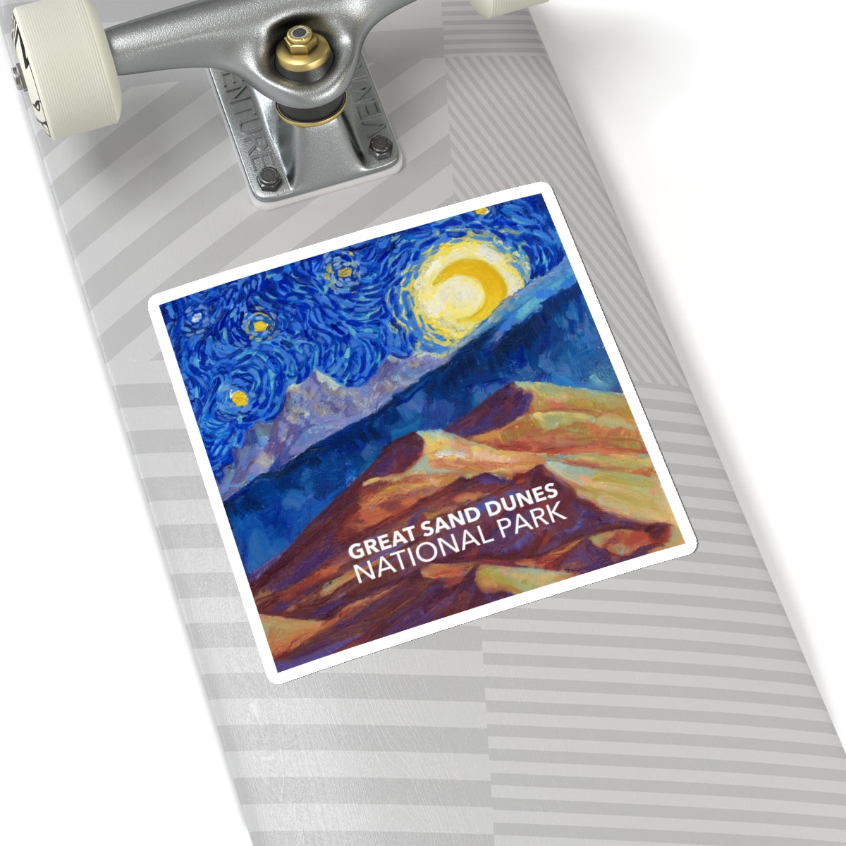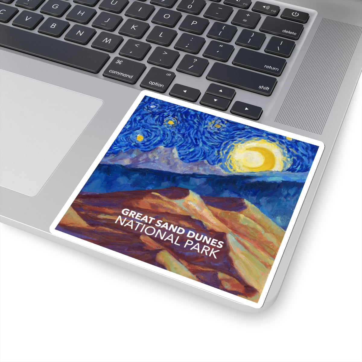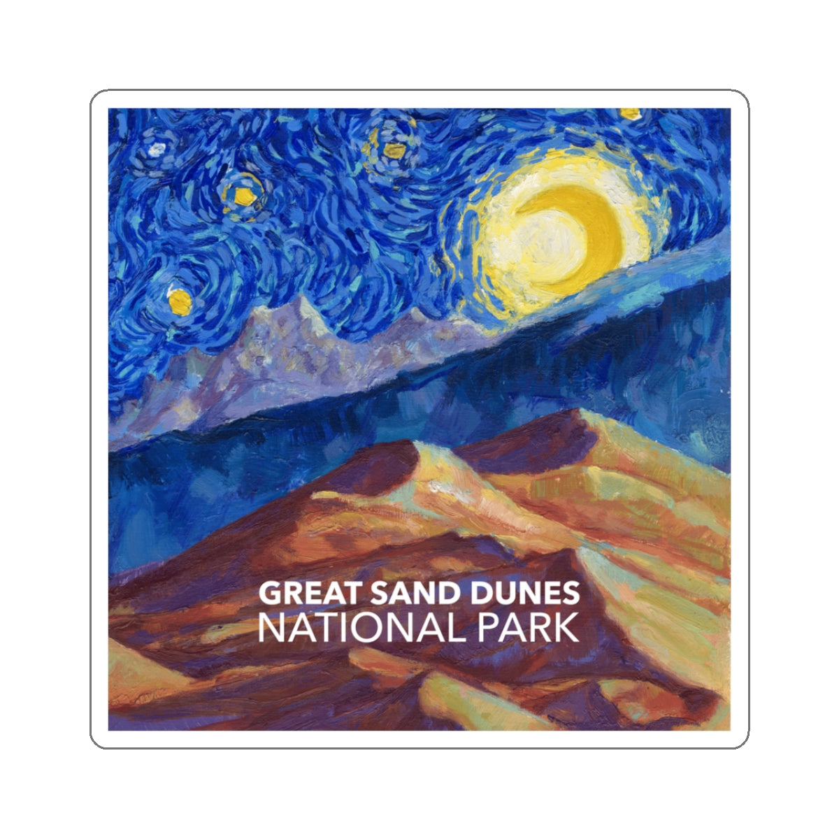 Celebrate the tallest sand dunes in North America in the style of Vincent van Gogh in the style of "Starry Night" with this Great Sand Dunes National Park sticker. The design is exclusive to National Parks Partnership so you won't find these stickers anywhere else.