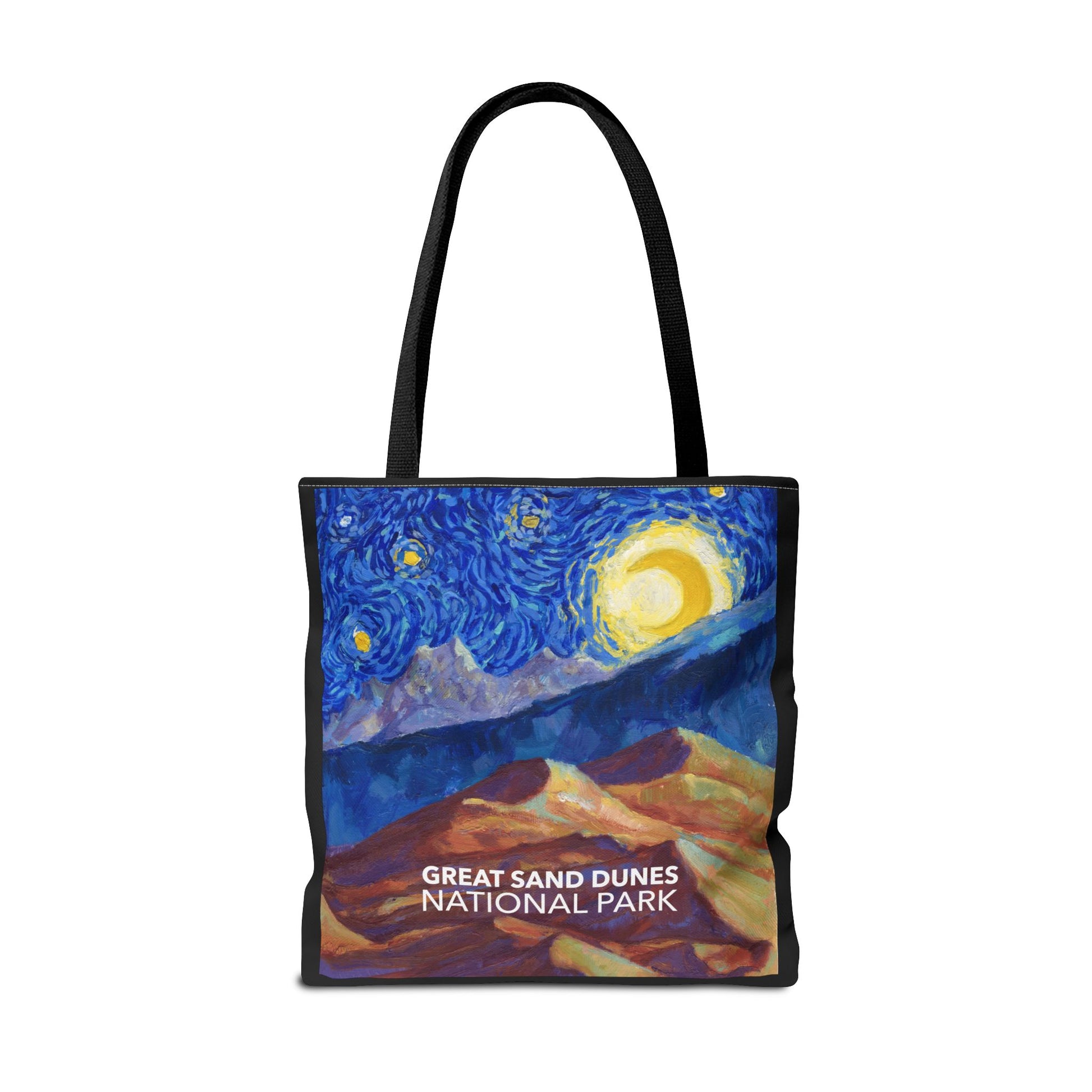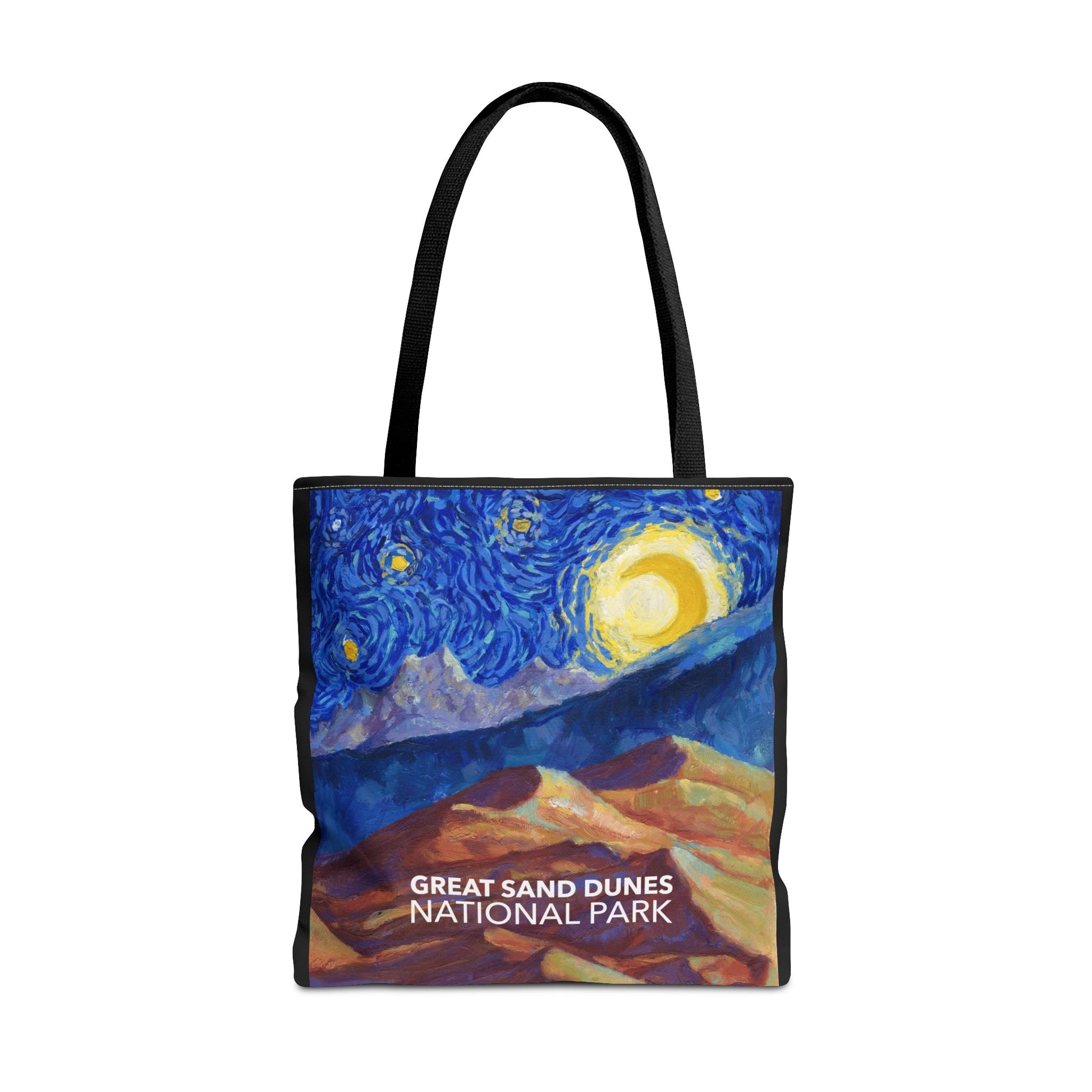 Celebrate the tallest sand dunes in North America with this Great Sand Dunes National Park tote bag. Inspired by Vincent van Gogh's iconic "The Starry Night". This tote bag is the perfect companion for your next national park adventure. Even if you are just taking a trip to the shops, this tote bag features a vibrant design, long straps and thick seams. Reduce your plastic waste and support the national parks! Printed in the USA. Every purchase helps support national parks.