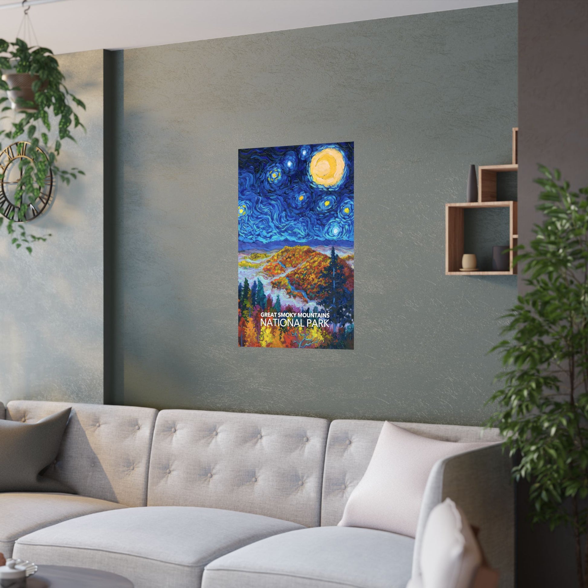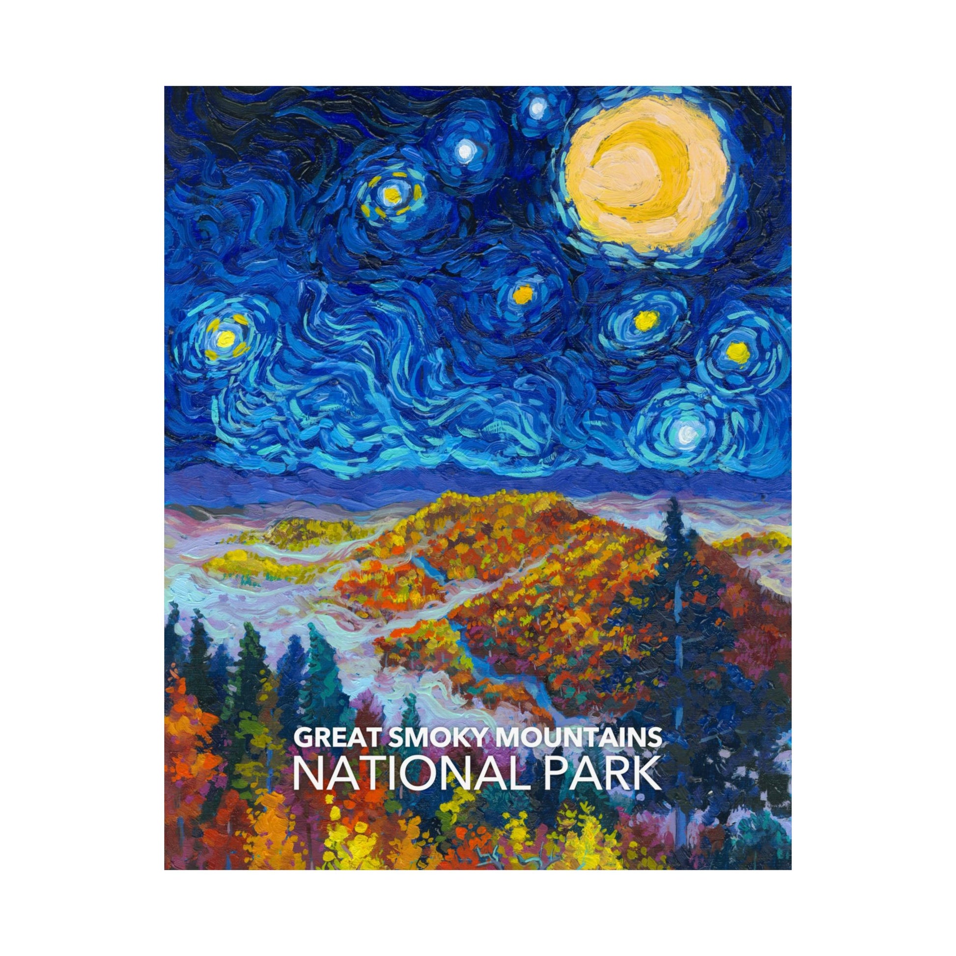 This Great Smoky Mountains National Park poster features the vibrant leaves and endless mountains that the park is known for. It is designed in the style of "The Starry Night" by Vincent Van Gogh. The large 24"x36" size is sure to be a conversation starter, while the 16"x20" looks great and is easy to frame. This design is exclusive to National Parks Collective so you won't find it anywhere else!