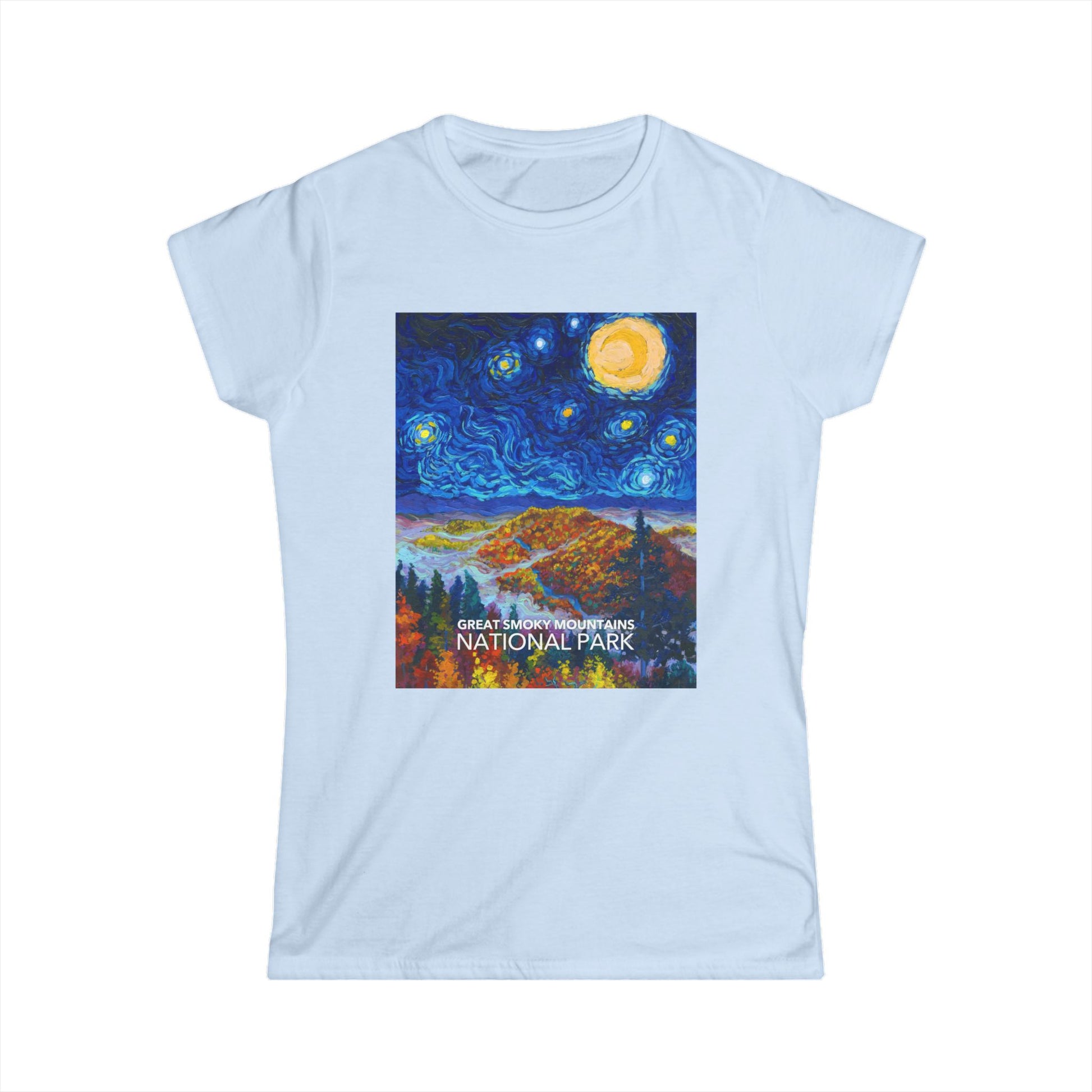 This Great Smoky Mountains National Park Women's T-shirt design is inspired by "The Starry Night" by Vincent van Gogh. Made from soft cotton, the shirts are slightly fitted for a flattering shape. Every purchase helps support national park charities. Designed and printed in the USA.