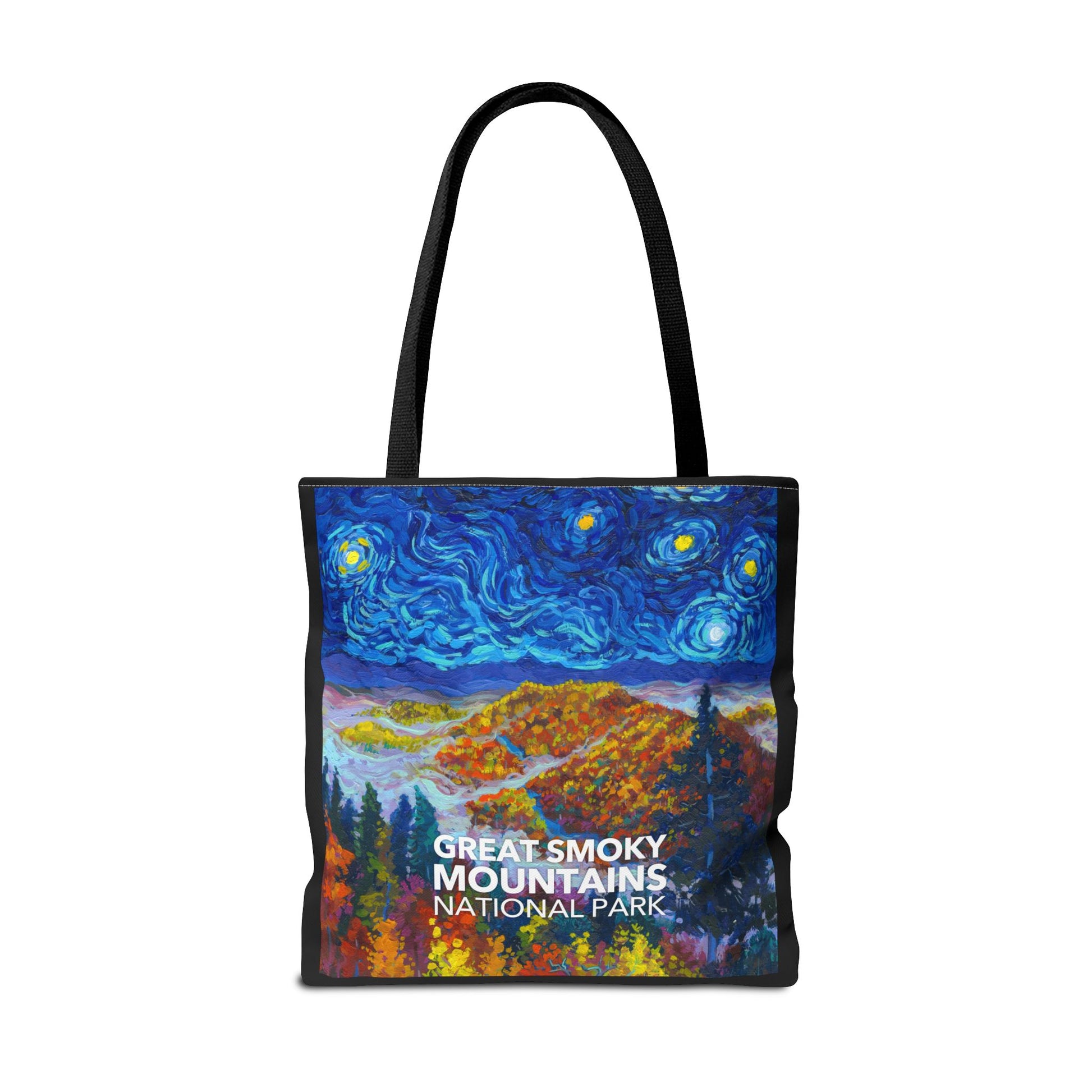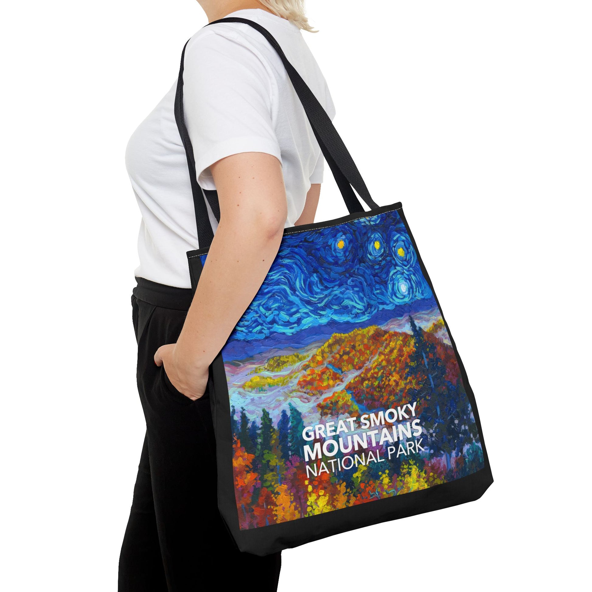 Celebrate the golden leaves of fall with this Great Smoky Mountains National Park tote bag. Inspired by Vincent van Gogh's iconic "The Starry Night". This tote bag is the perfect companion for your next national park adventure. Even if you are just taking a trip to the shops, this tote bag features a vibrant design, long straps and thick seams. Reduce your plastic waste and support the national parks! Printed in the USA. Every purchase helps support national park charities.