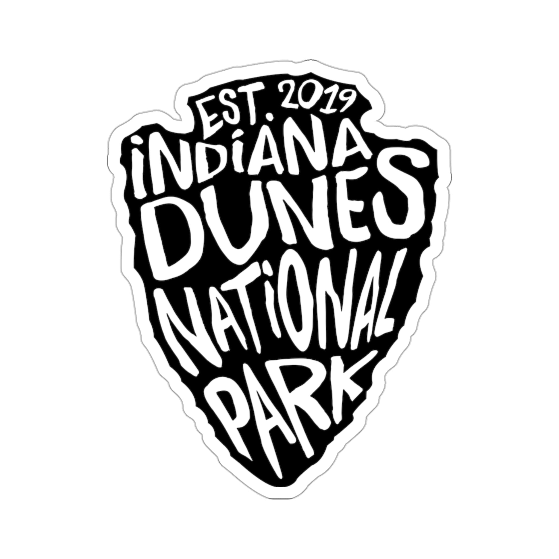 Show your love for Indiana Dunes National Park with this stylish sticker! The sticker features a black arrowhead with the park's name stenciled on in chunky white letters. The arrowhead is a symbol of the National Park Service, and it represents the park's commitment to preserving nature and history.