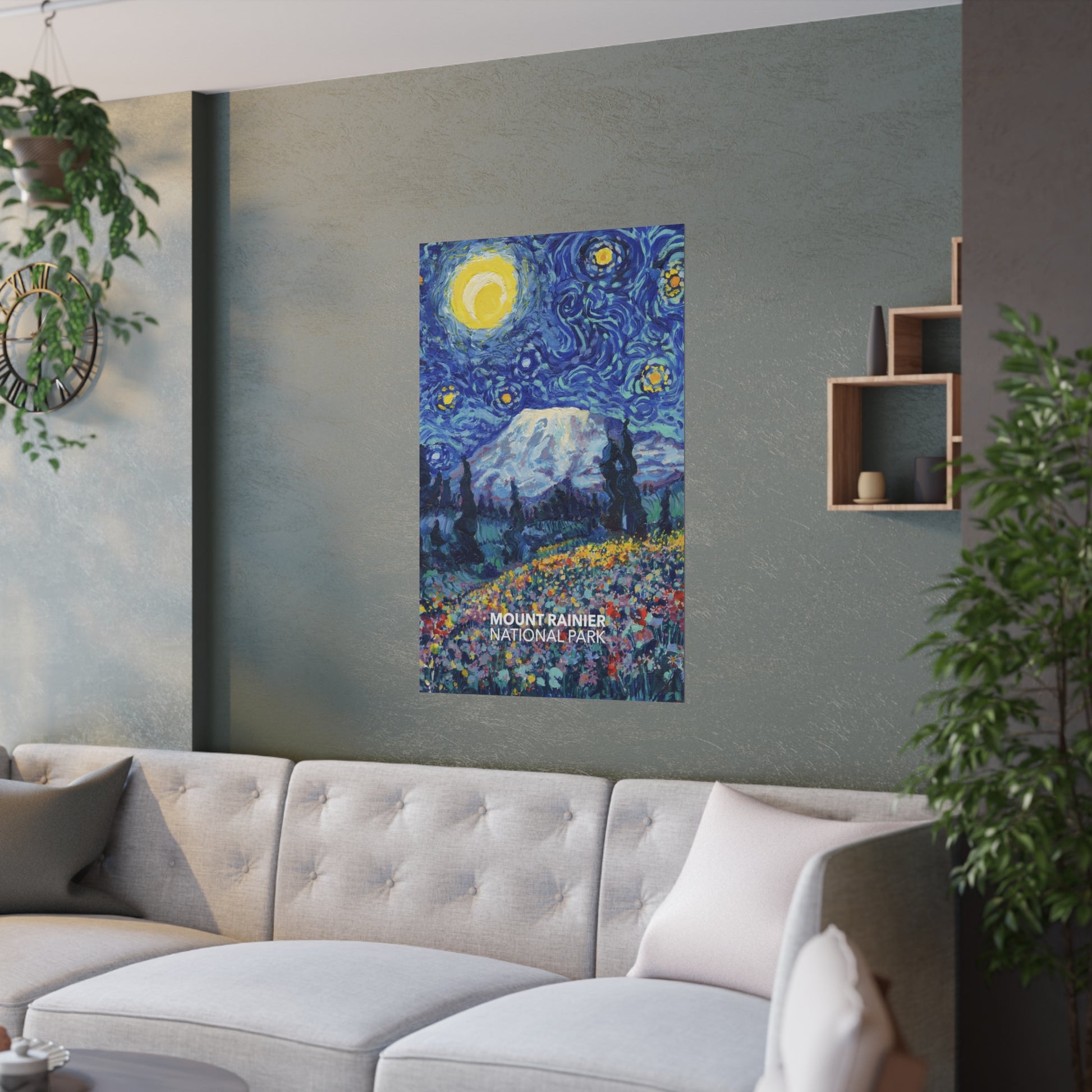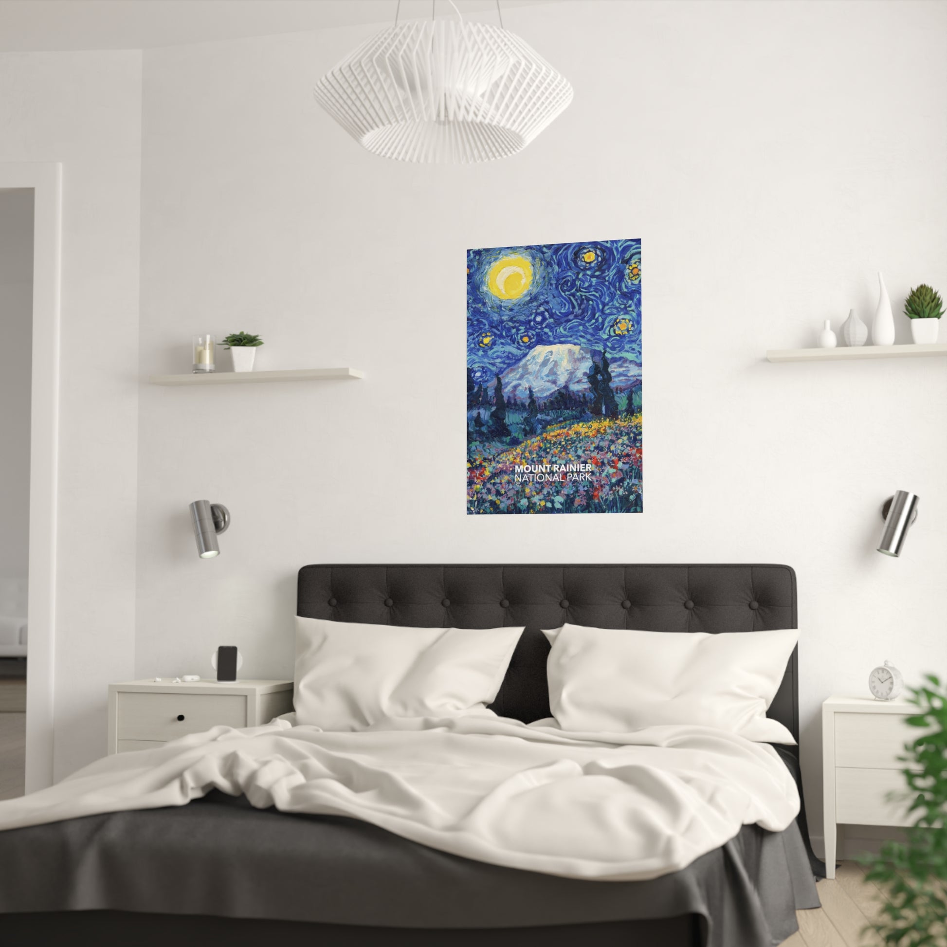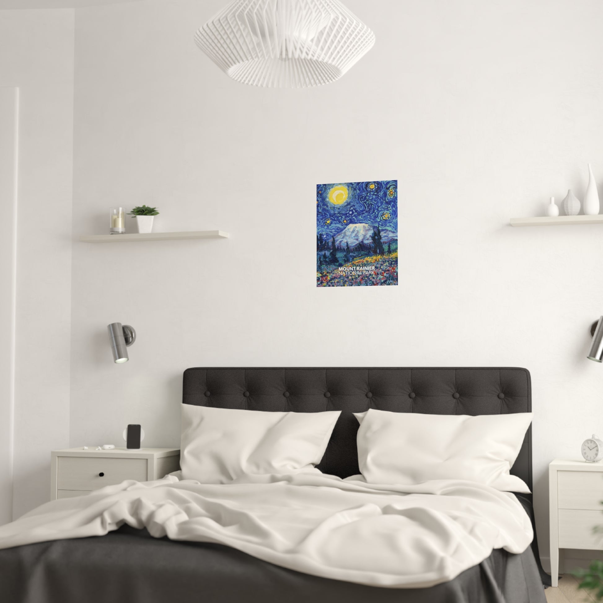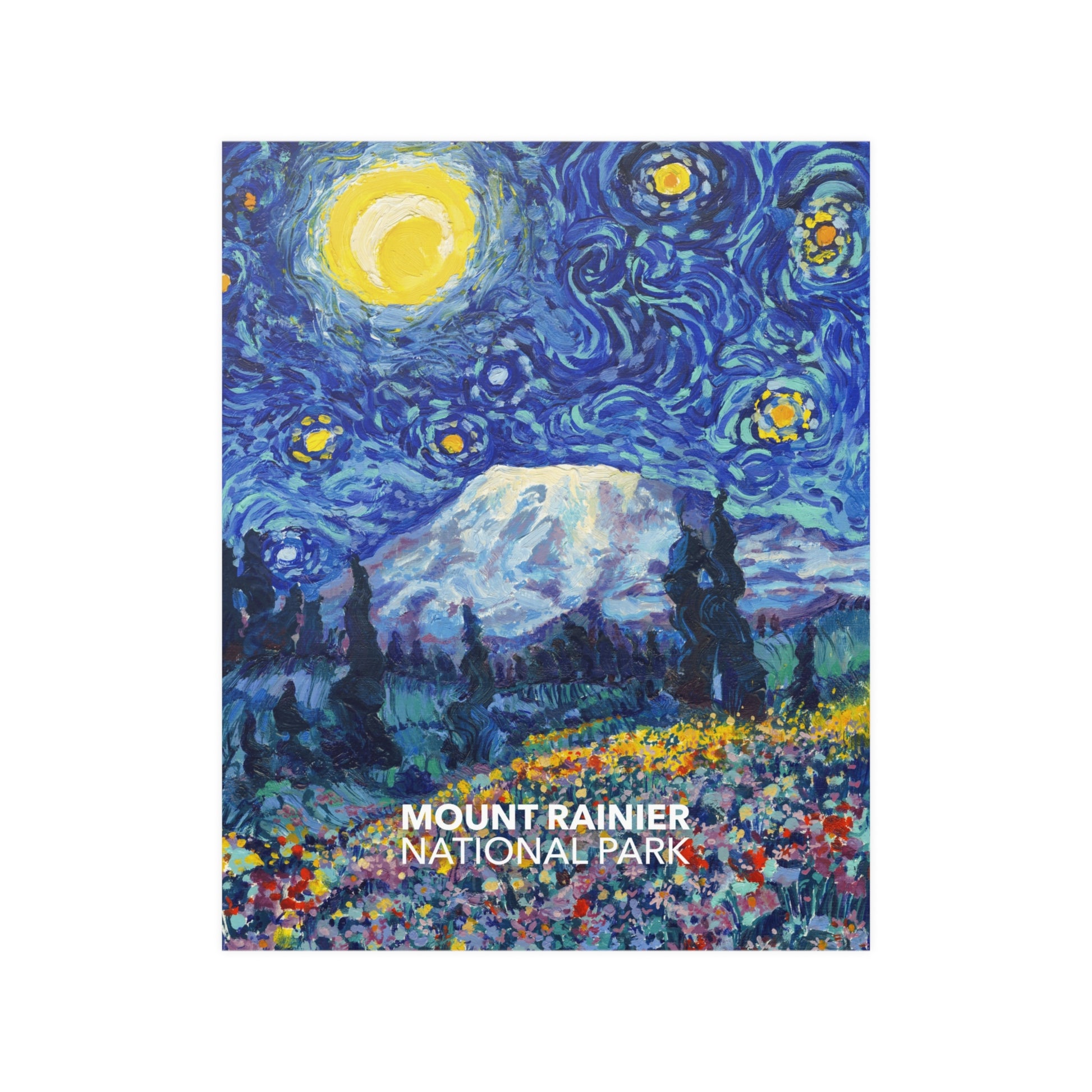 This Mount Rainier National Park poster features the towering startovolcano that the park is known for. It is designed in the style of "The Starry Night" by Vincent Van Gogh. The large 24"x36" size is sure to be a conversation starter, while the 16"x20" looks great and is easy to frame. This design is exclusive to National Parks Partnership so you won't find it anywhere else!