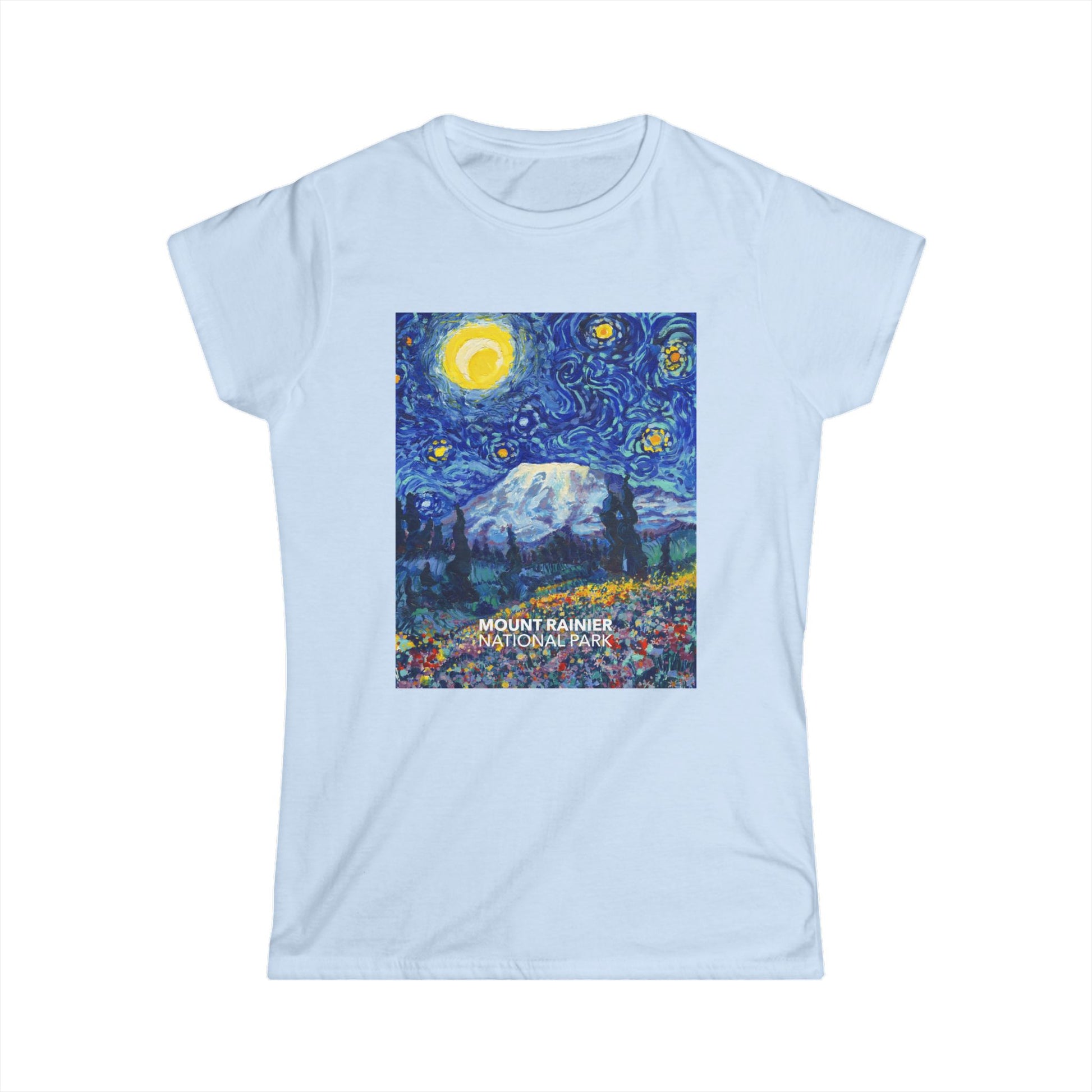 This Mount Rainier National Park Women's T-shirt design is inspired by "The Starry Night" by Vincent van Gogh. Made from soft cotton, the shirts are slightly fitted for a flattering shape. All sales support national parks. Designed and printed in the USA.