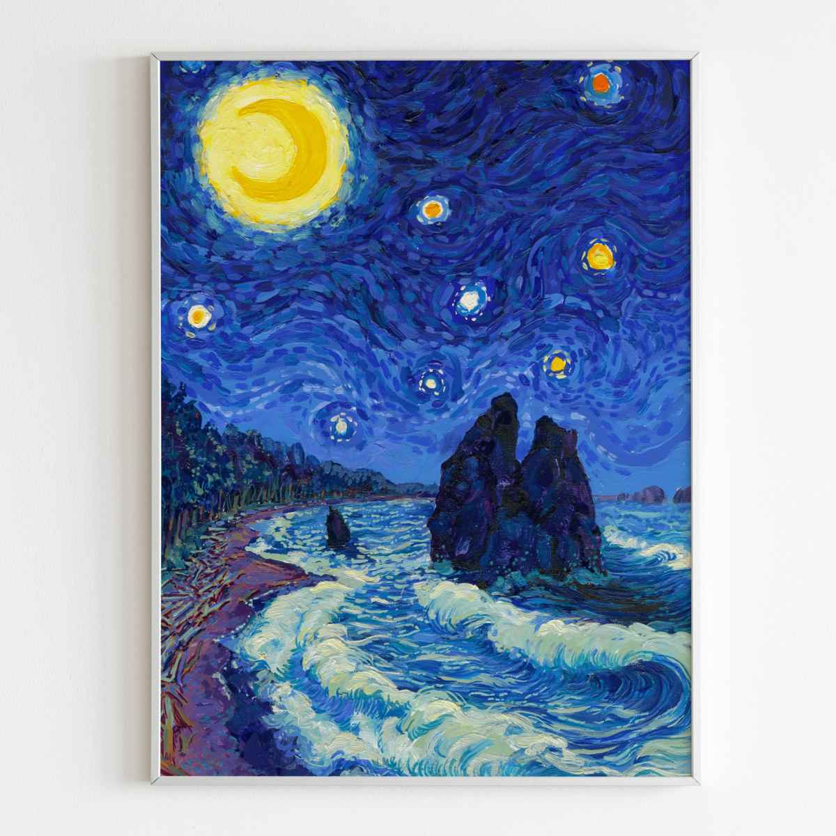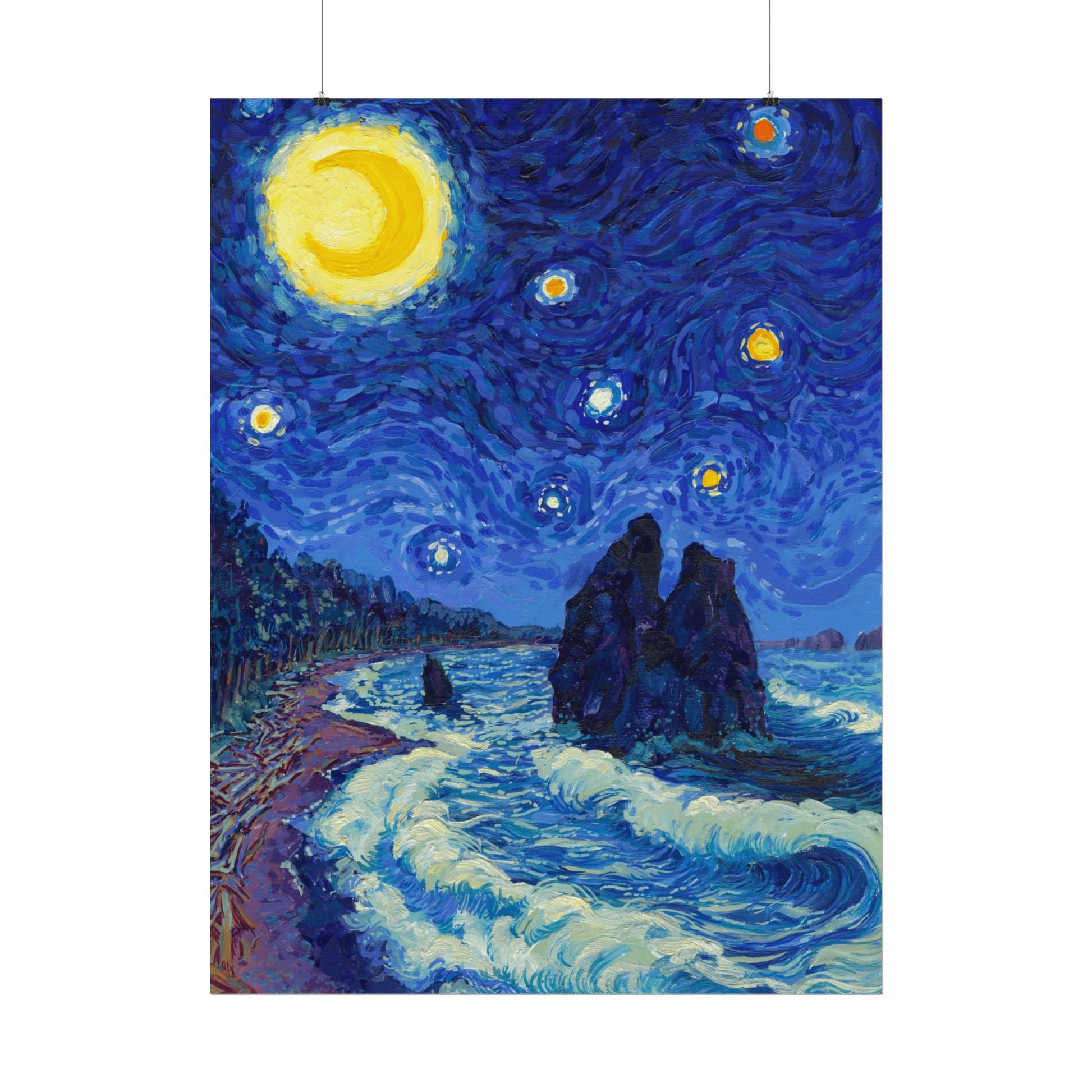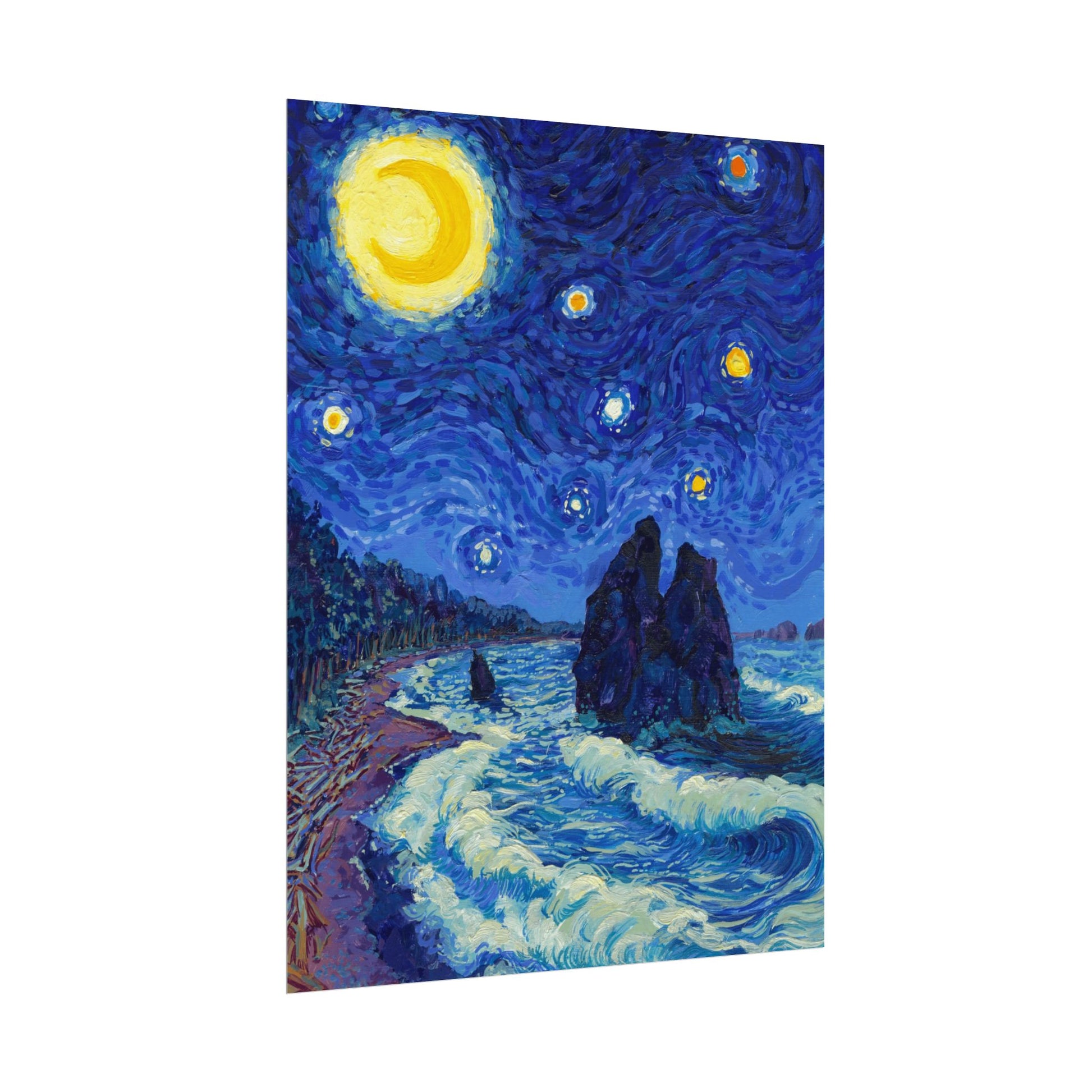 This Olympic National Park Poster has to be seen to be believed! We took the highest resolution scans of our hand-painted Starry Night Olympic National Park painting and printed it on incredible 285gsm textured paper. When combined with the archival inks, the finished product is almost indistinguishable from the original painting. This is the ultimate version of our Starry Night series.