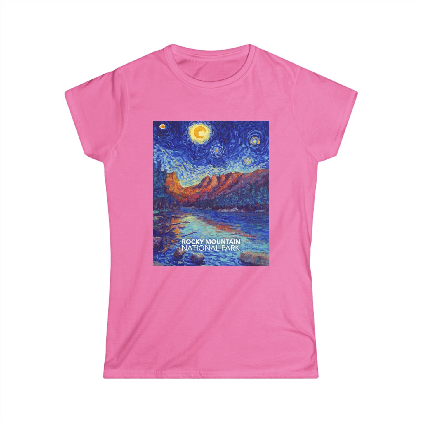 This Rocky Mountain National Park Women's T-shirt design is inspired by "The Starry Night" by Vincent van Gogh. Made from soft cotton, the shirts are slightly fitted for a flattering shape. All sales help support national park charities. Designed and printed in the USA.