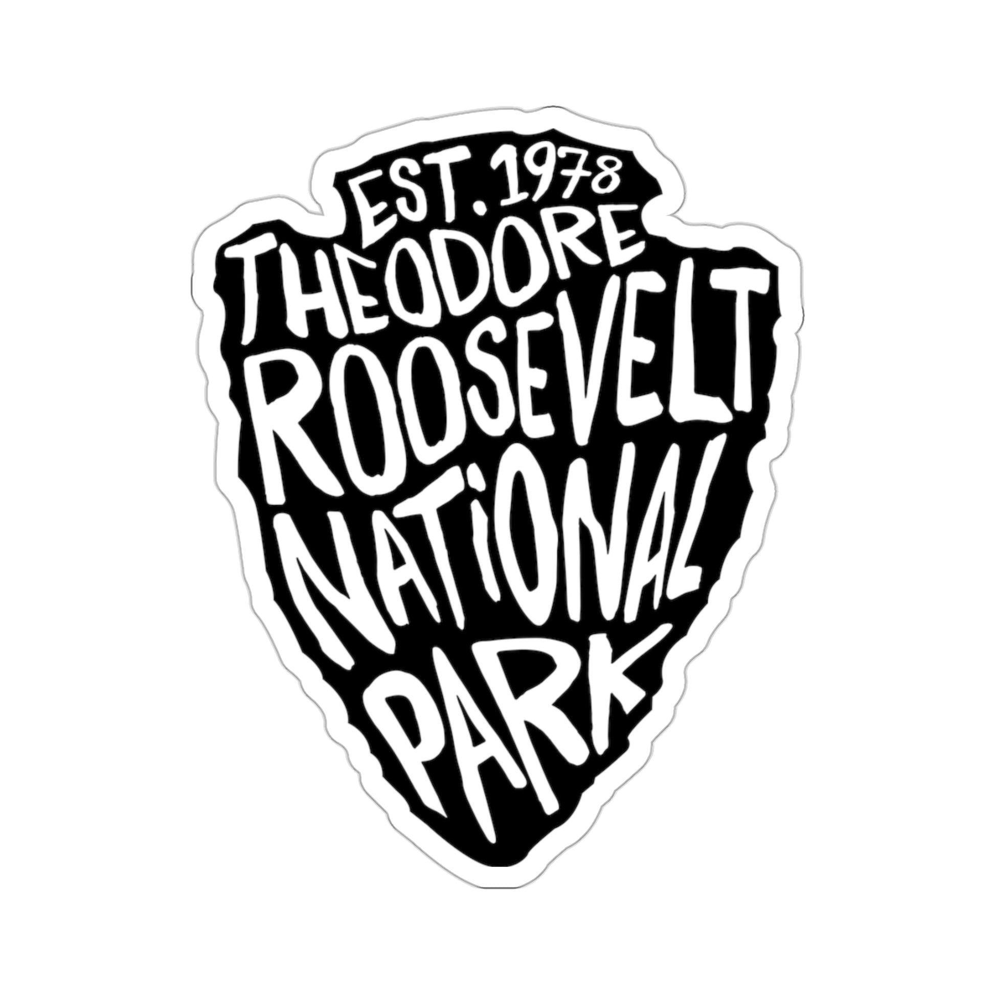 This black and white sticker features a stylized arrowhead with the words "Theodore Roosevelt National Park" stenciled in chunky white letters. The arrowhead is a symbol of the National Park Service, and this sticker is a great way to show your support for the park and its mission.