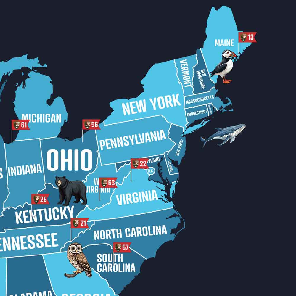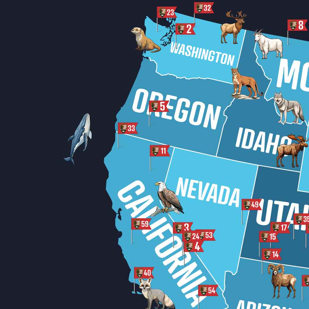 The map also has pictures of some of the iconic animals that call the national parks home, such as humpback whales, bison, wolves, moose, bears, puffins and many more!