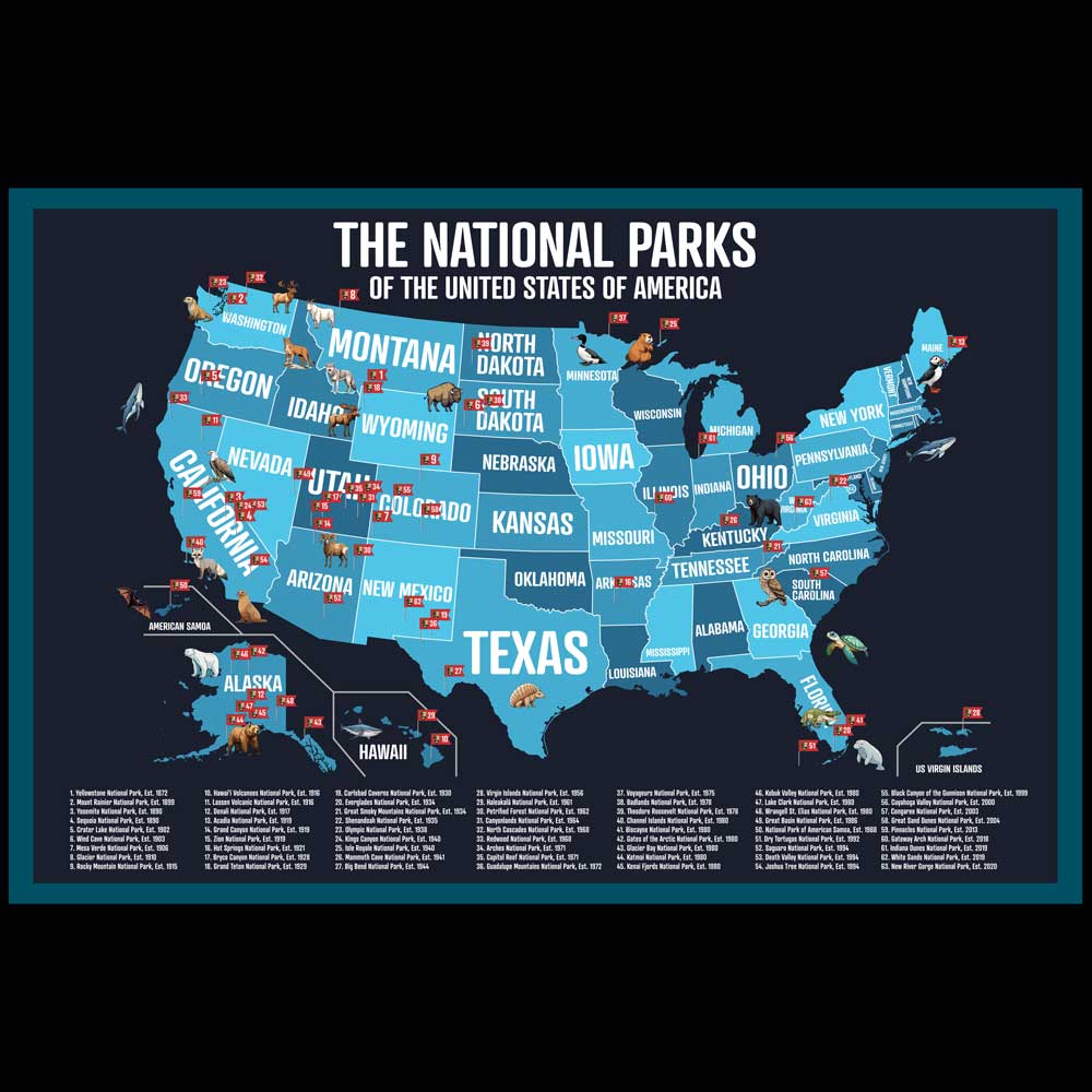 The map features the 63 national parks of the USA marked by flags. The numbers on the flags can be used to look up the parks using the table below the map. The parks are listed in which they were designated as national parks, which provides a fascinating glimpse into the development of the NPS.