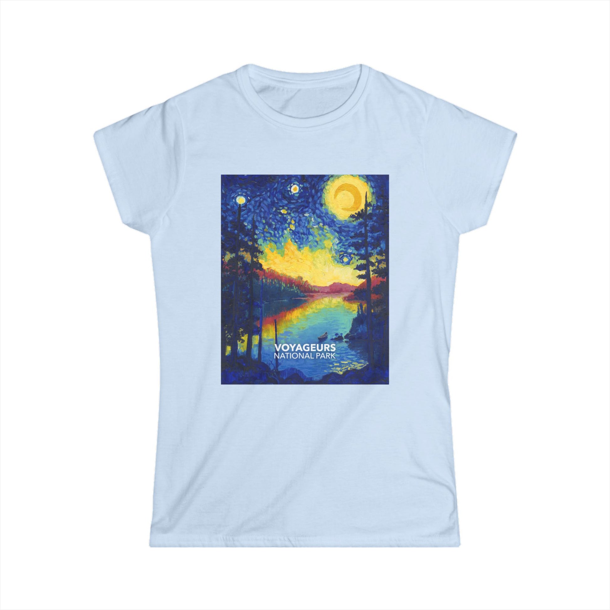 This Voyageurs National Park Women's T-shirt design is inspired by "The Starry Night" by Vincent van Gogh. Made from soft cotton, the shirts are slightly fitted for a flattering shape. All sales support national park charities. Designed and printed in the USA.