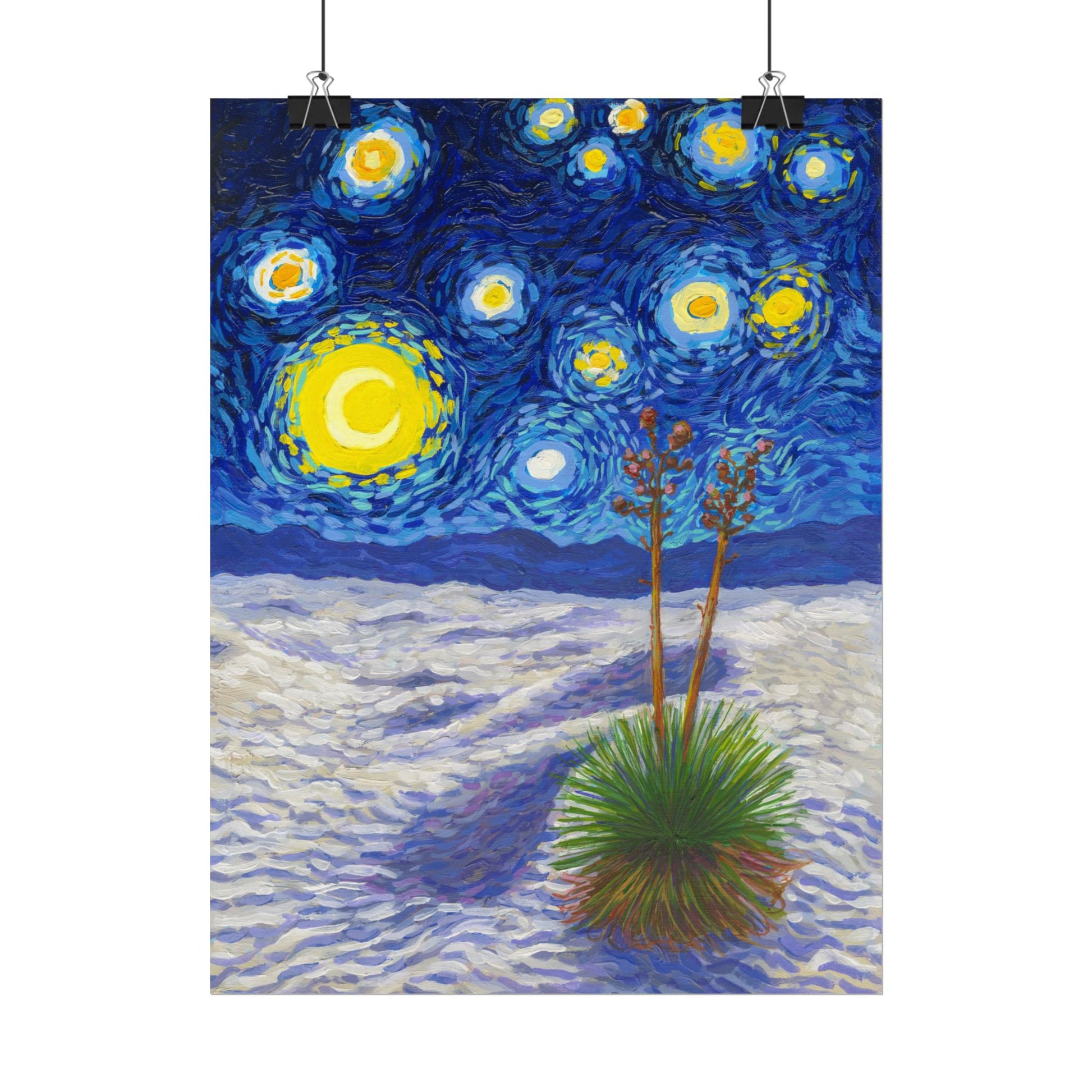 This White Sands National Park Poster has to be seen to be believed! We took the highest resolution scans of our hand-painted Starry Night White Sands National Park painting and printed it on incredible 285gsm textured paper. When combined with the archival inks, the finished product is almost indistinguishable from the original painting. This is the ultimate version of our Starry Night series.