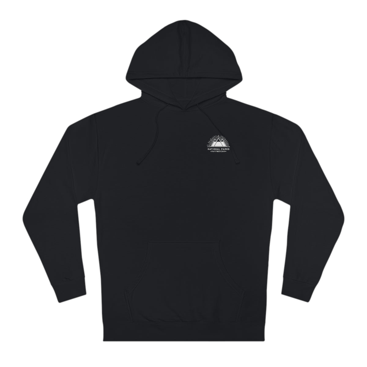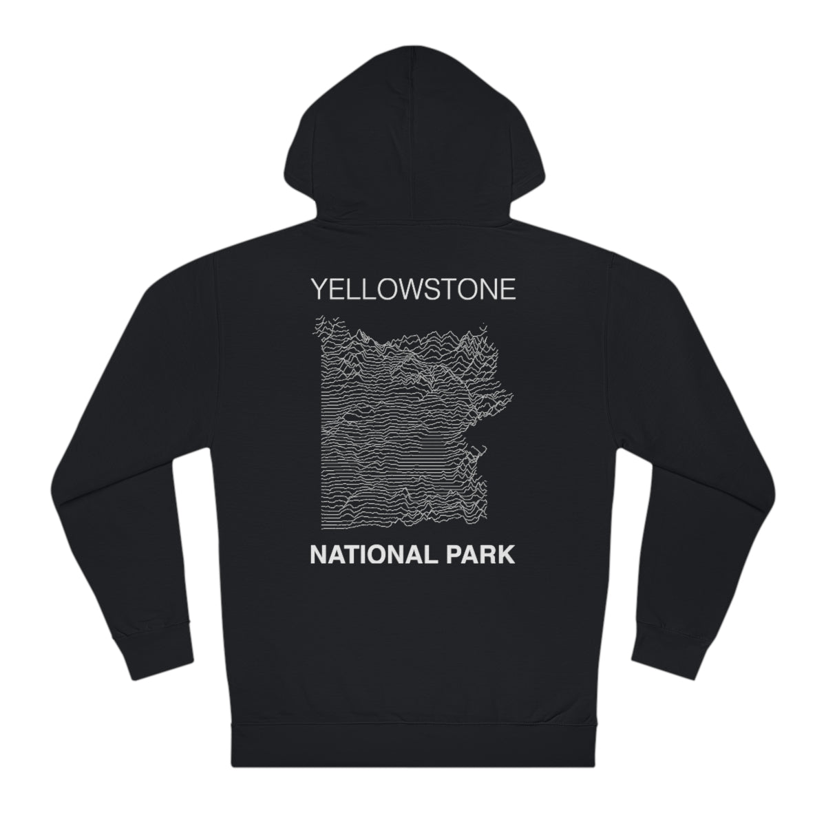 This hoodie features a design reminiscent of the cover of the classic 1979 album "Unknown Pleasures" by Joy Division, which has become an icon of modern graphic design since its release over 40 years ago. The lines on the album cover were a graphical representation of radio waves received from distant pulsars. We have reinterpreted that aesthetic with elevation lines from our national parks.