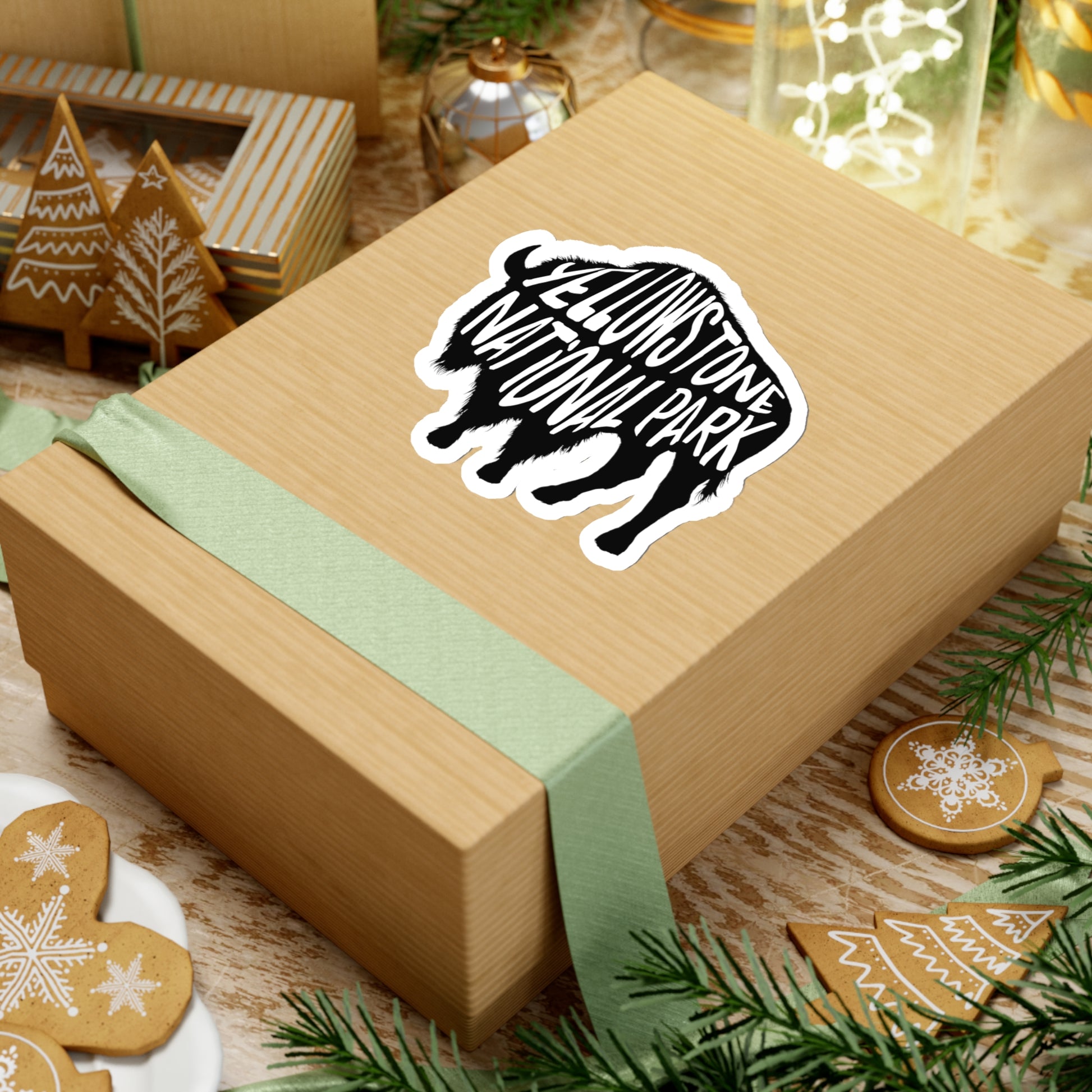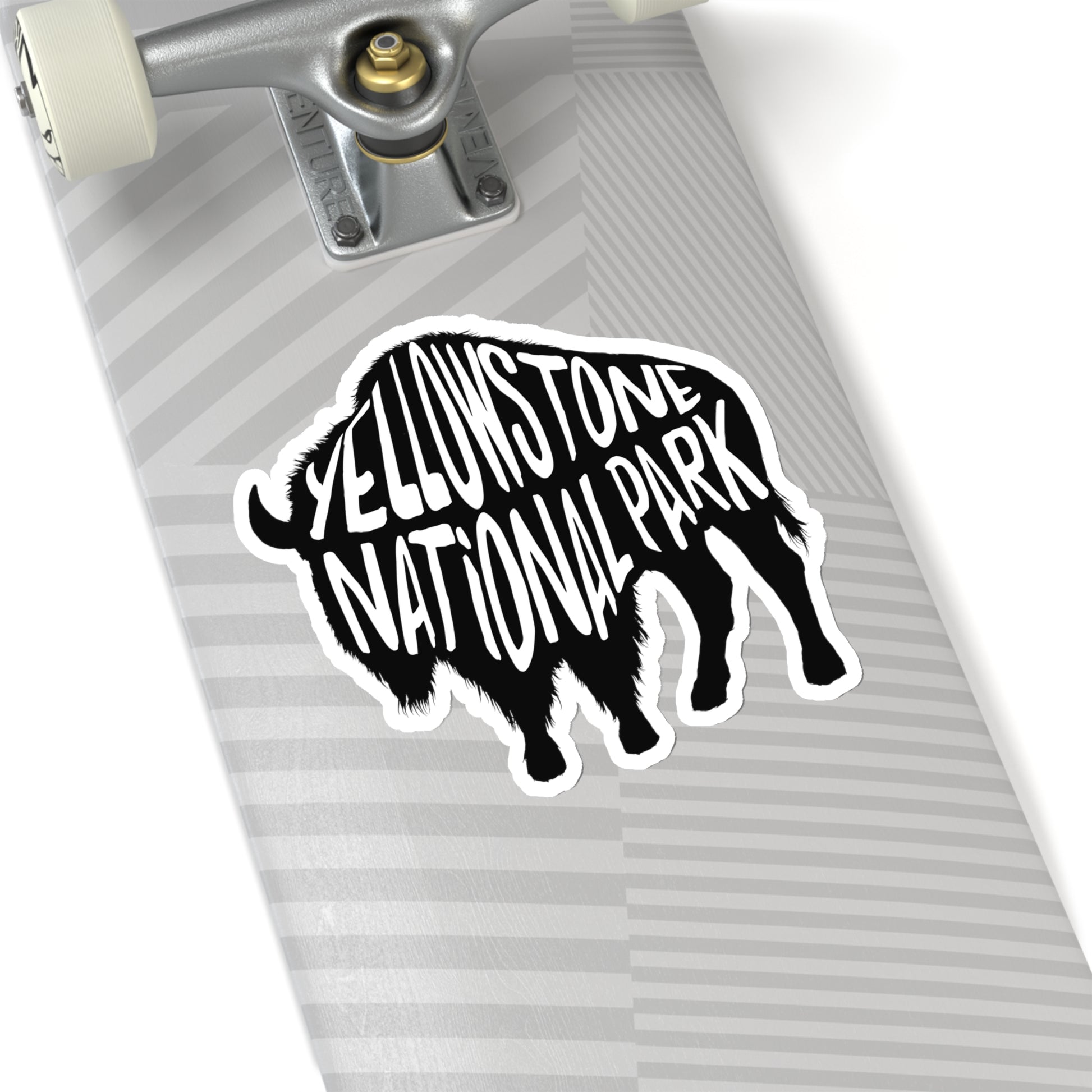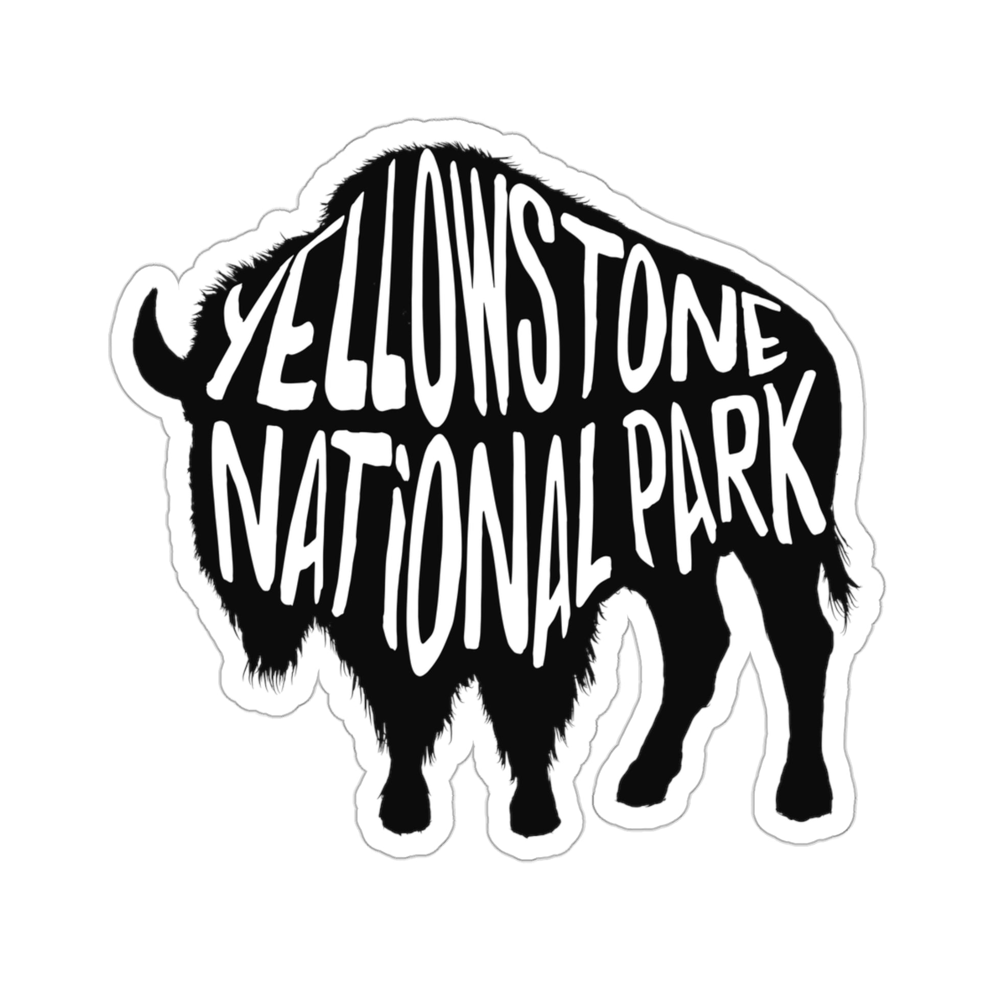 This sticker features a black silhouette of a bison against a white background. The name of the park is stenciled in chunky white lettering across the top. The sticker is kiss-cut, so the edge of the sticker mirrors the design. It comes in three sizes: 3"x 3", 4"x 4", and 6"x 6".