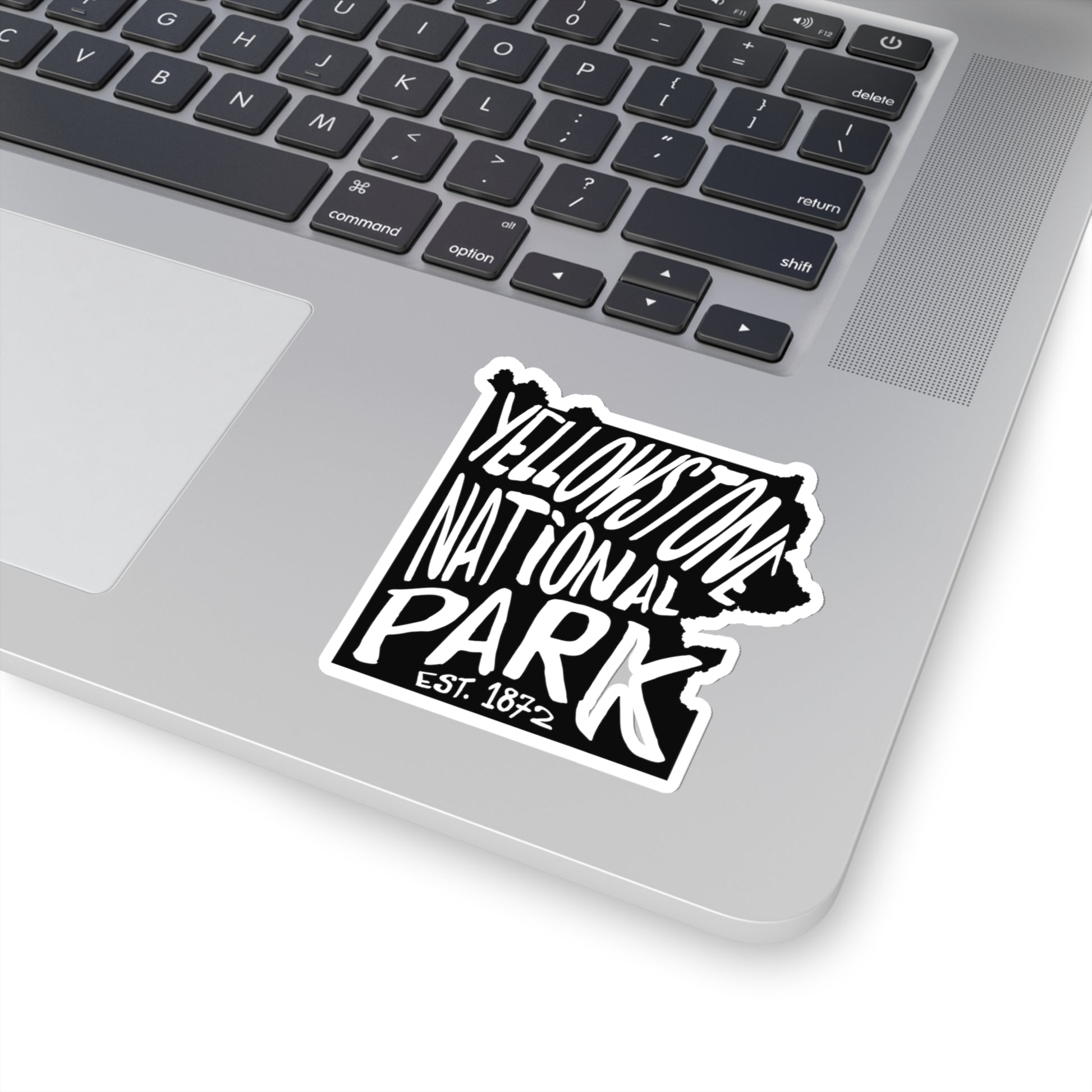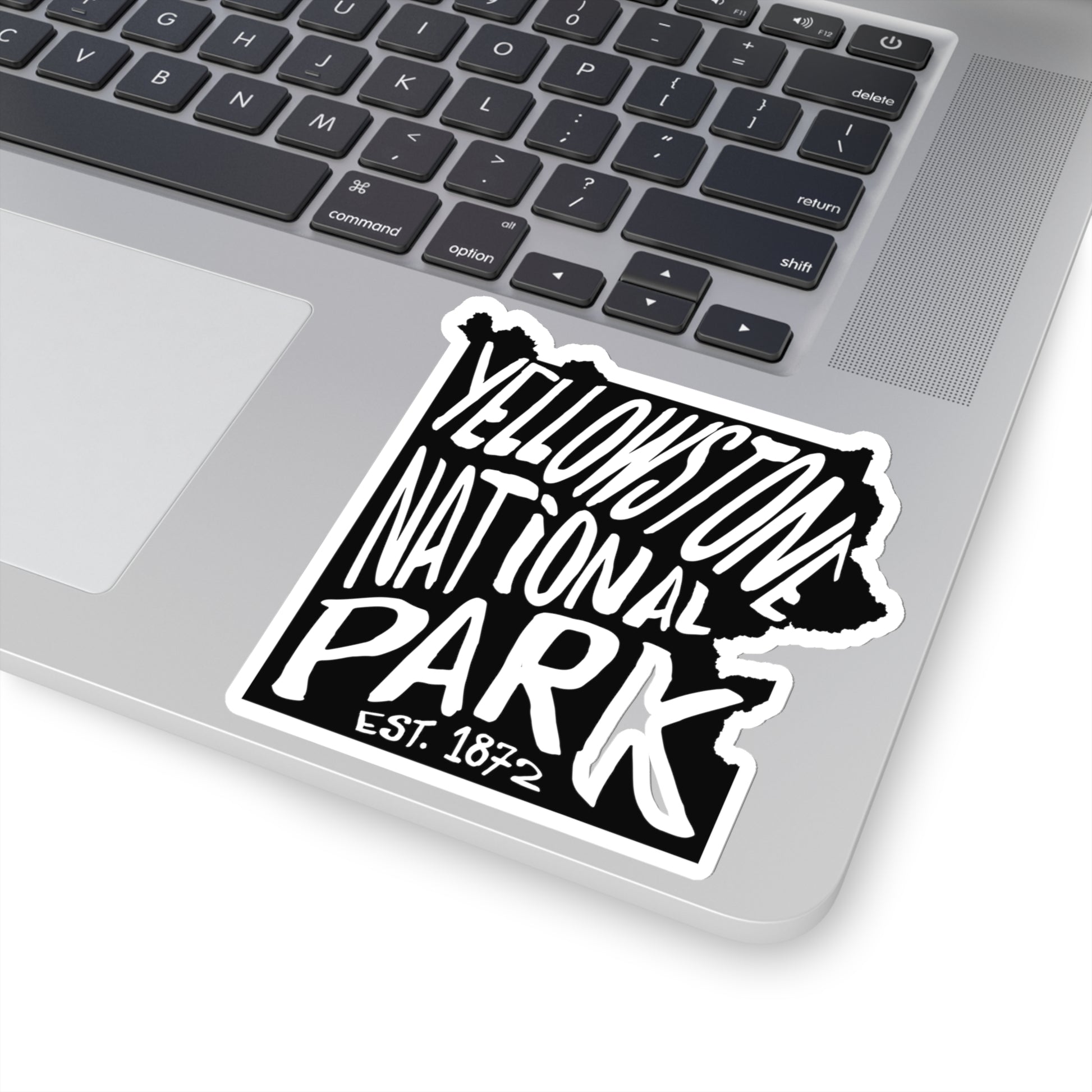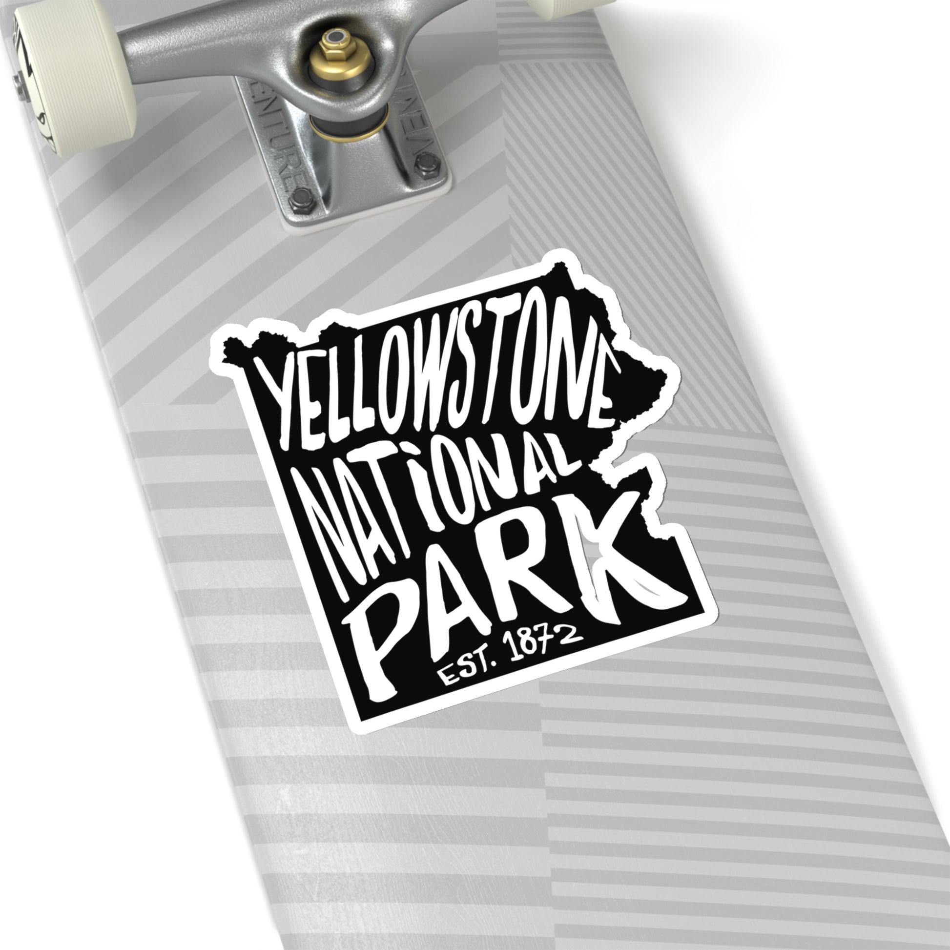 This Yellowstone National Park sticker is a great way to show your love for the park. It is available in three sizes: 3"x 3", 4"x 4", and 6"x 6". It is for indoor use only and is not waterproof. The design features a map of the park with the park's name stenciled on top. The sticker is kiss cut, so the edge of the sticker mirrors the design.