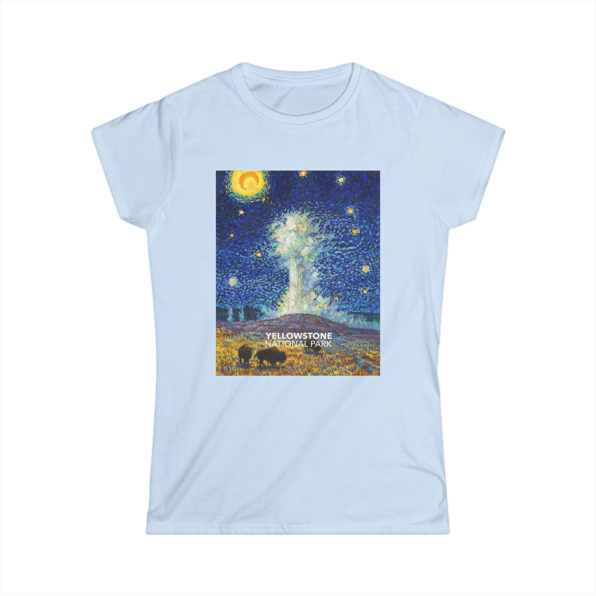 This Yellowstone National Park Women's T-shirt design is inspired by "The Starry Night" by Vincent van Gogh. Made from soft cotton, the shirts are slightly fitted for a flattering shape. Every sale helps support national park charities. Designed and printed in the USA.