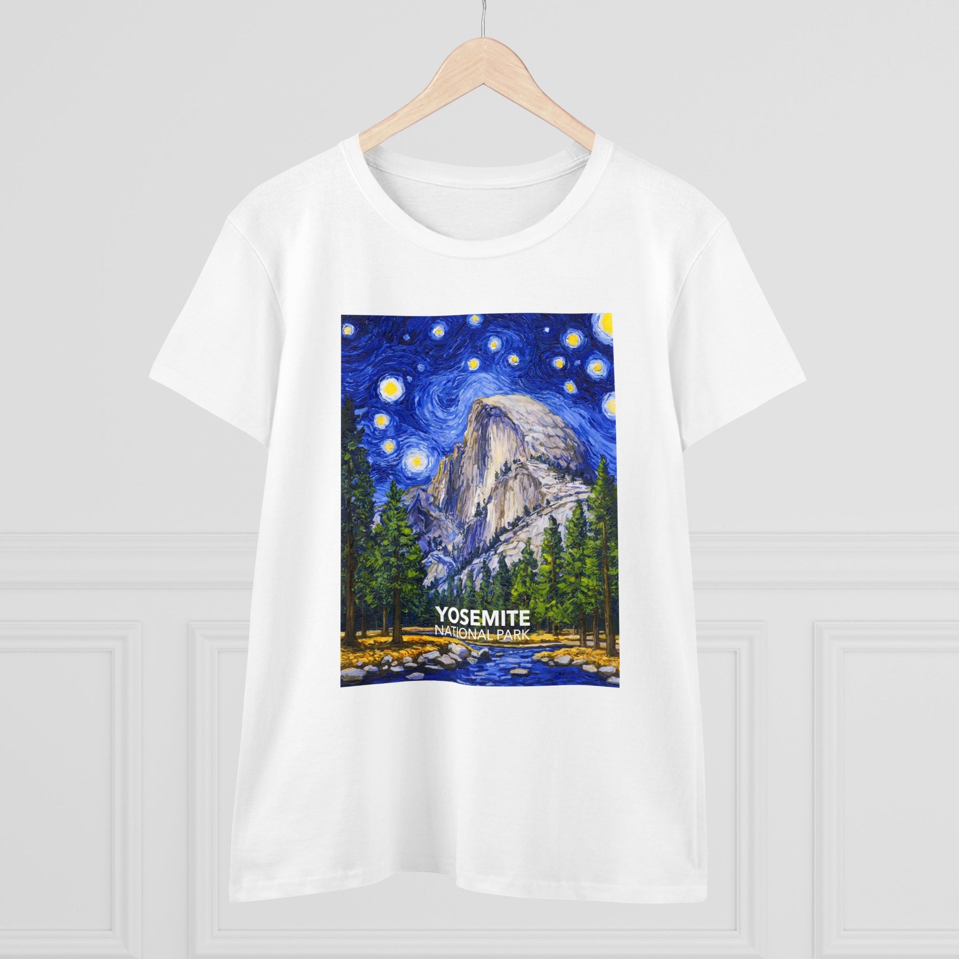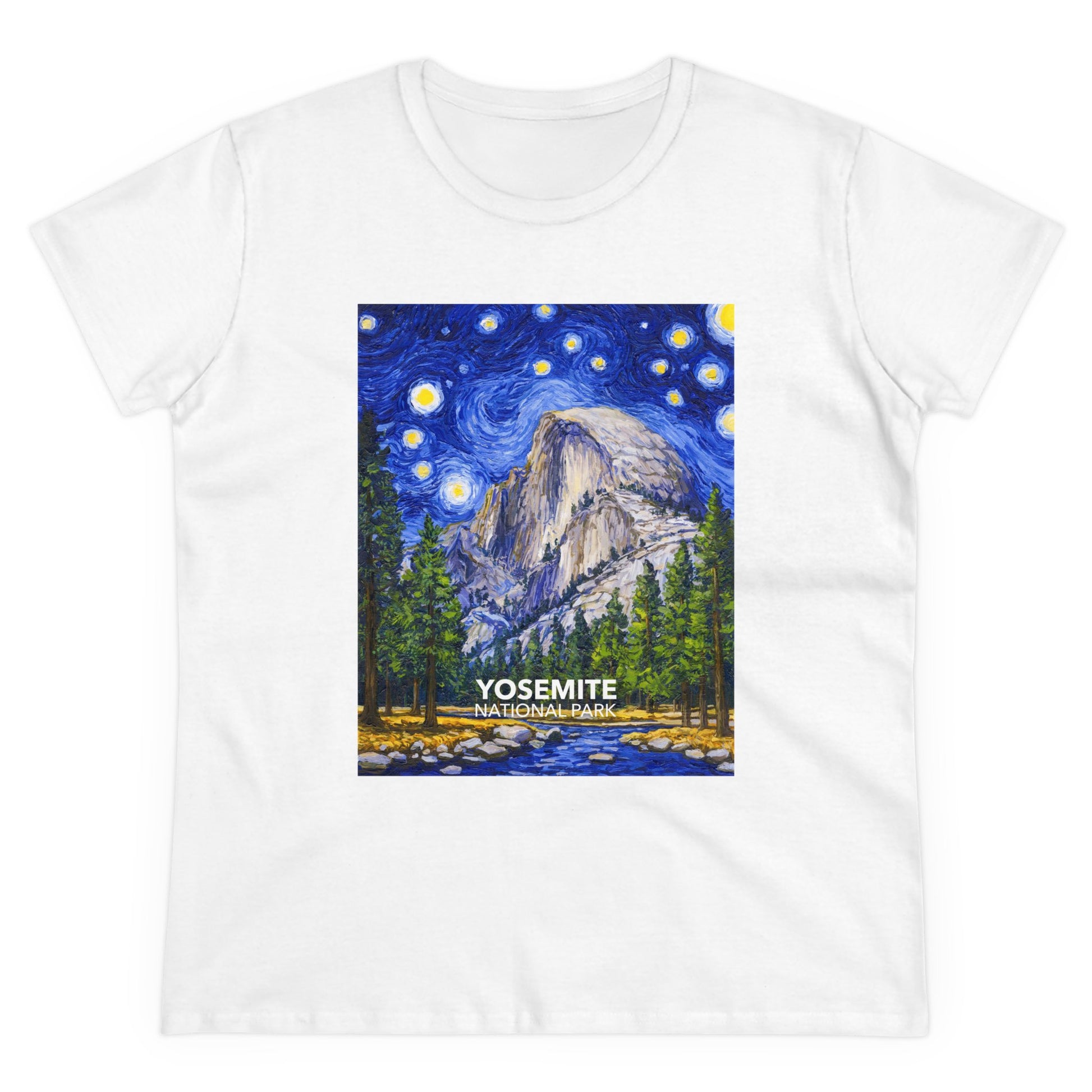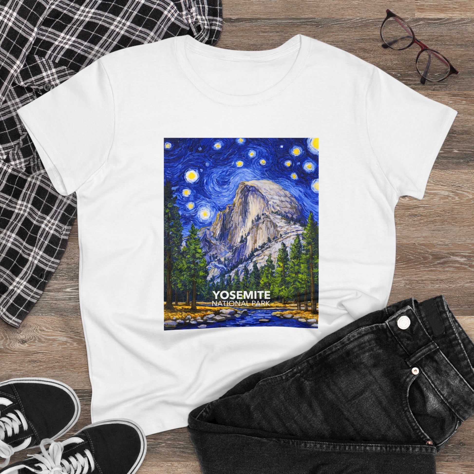 This Yosemite National Park Women's T-shirt design is inspired by "The Starry Night" by Vincent van Gogh. Made from soft cotton, the shirts are slightly fitted for a flattering shape. All sales help support national park charities. Designed and printed in the USA.