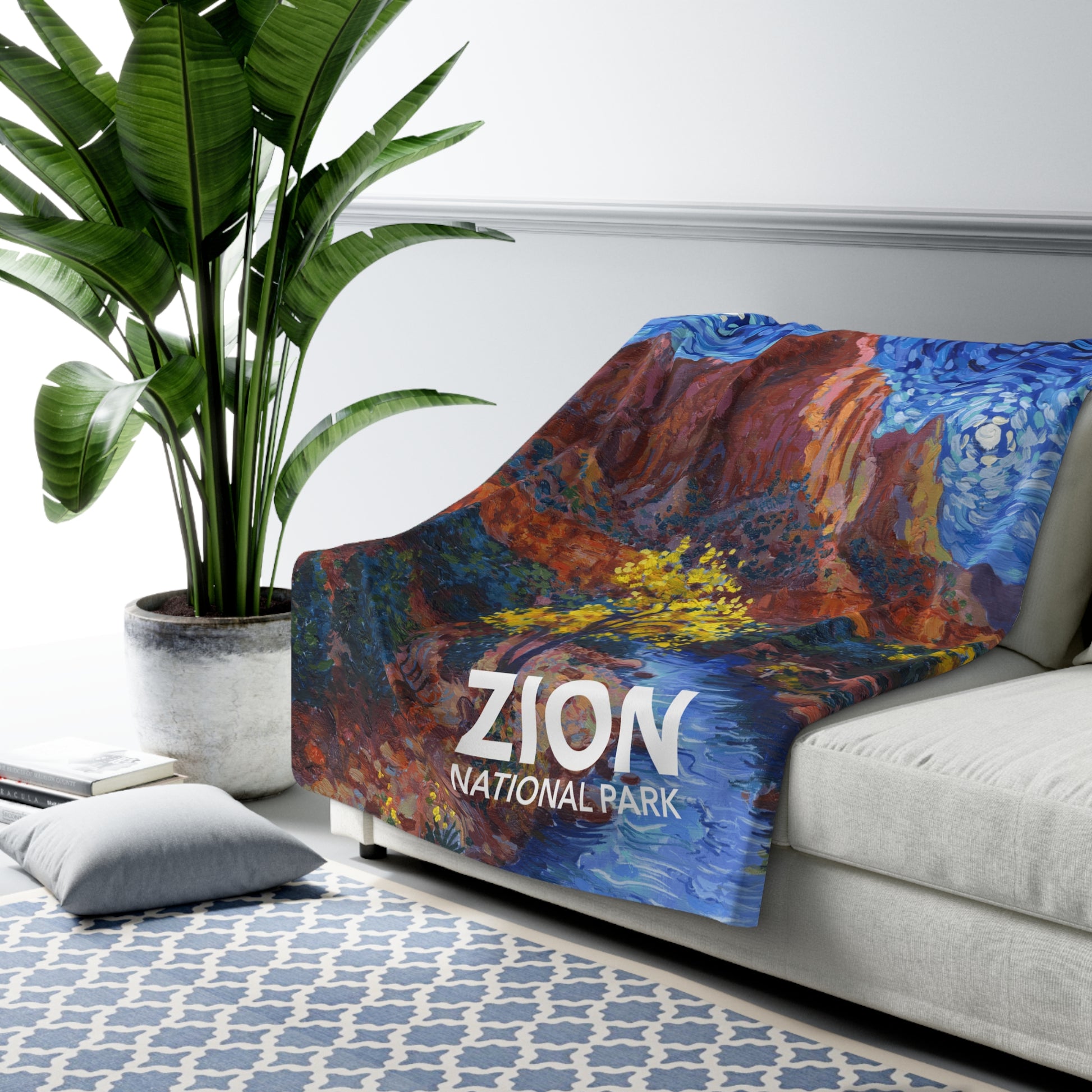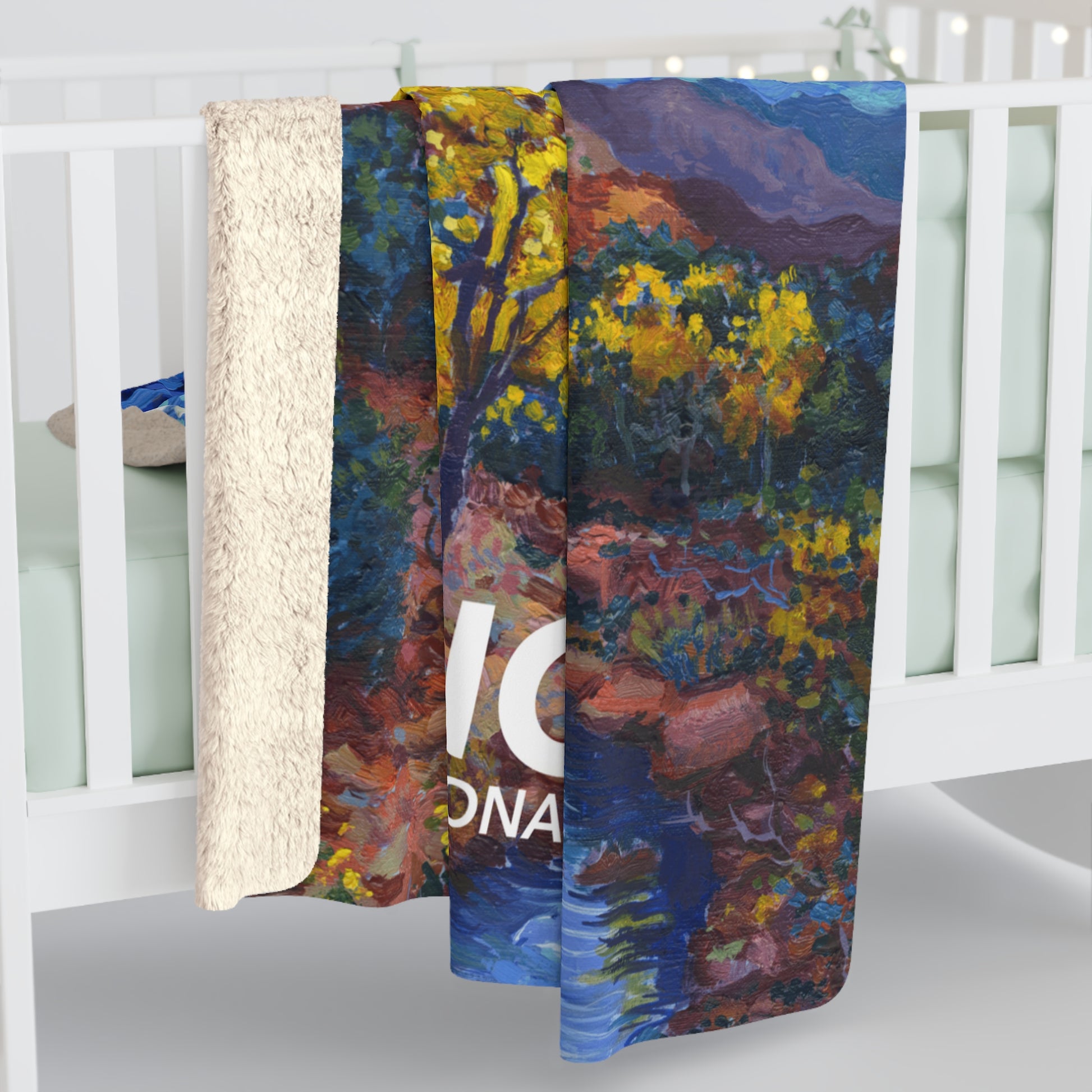 This Zion National Park blanket is thick and fluffy. Perfect for nights around the fire in the cabin or watching the stars on a cloudless night. The design is printed in vibrant colors on one side, while the reverse is soft sherpa fleece.